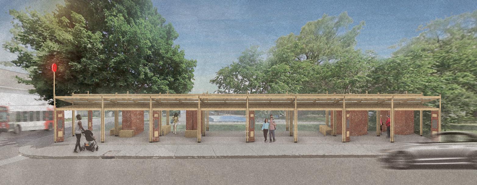 thereby introducing circular principles to the microeconomy of Overbrook. The project uses square timber modules as a base, which can be configured in varying quantities and shapes depending on site, program, and demand. Under this canopy, programmatic elements may be added as needed, making every intervention unique. Thus, Circular Overbrook can be assembled, disassembled, and reassembled in perpetuity. Evoking playfulness, comfort, elegance, and joy in their use, these interventions seek to enrich the mundane experience of public transportation and create a sense of belonging and pride.