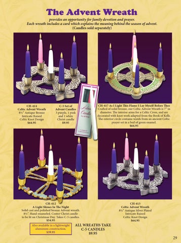 CH-412 A Light Shines In The Night Solid cast and polished bronze Advent wreath. 8½”. Hand-enameled. Center Christ candle to be lit on Christmas Day. Takes C-5 candles. $54.95 Also available in a lightweight aluminum construction. $39.95
