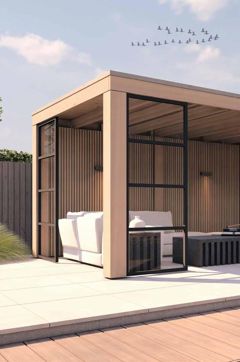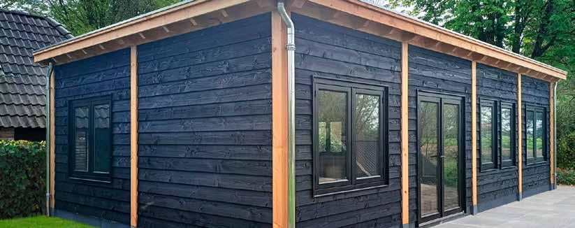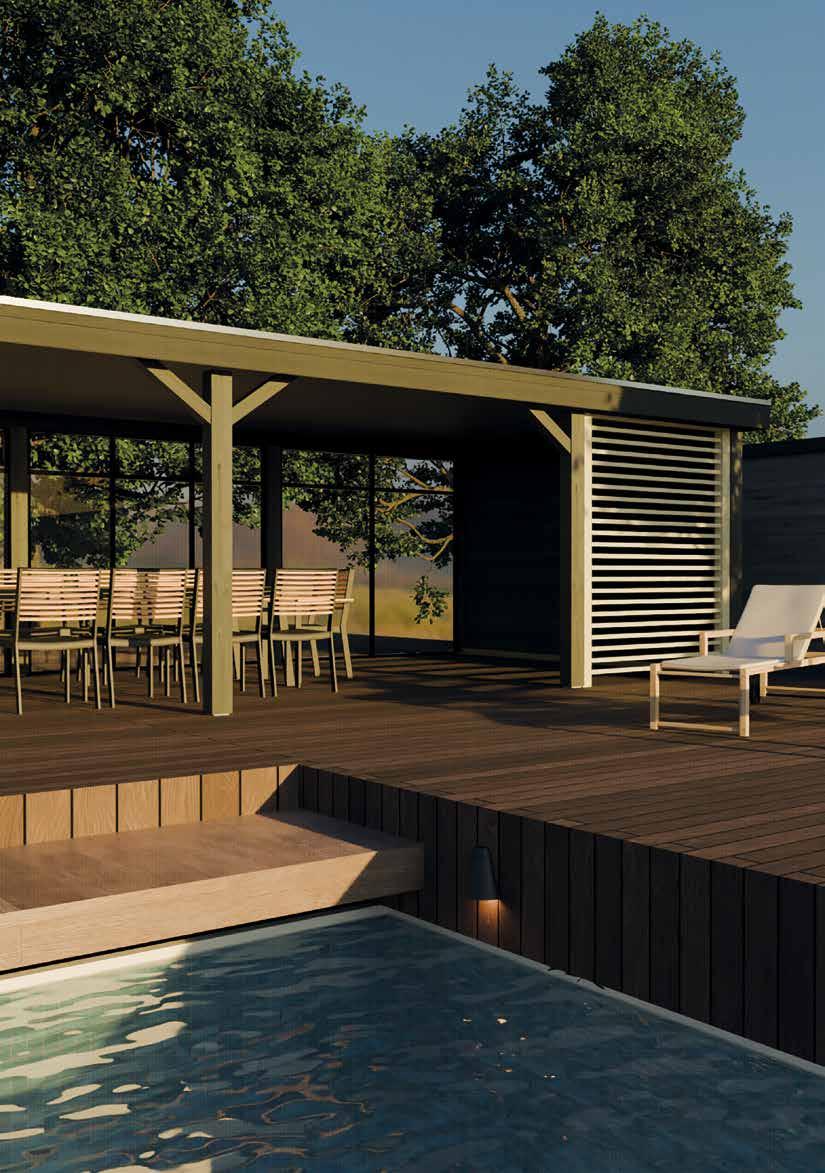 Buitenverblijf Outline is ruim opgezet en herken je aan haar simplistisch ontwerp. Eenvoud staat centraal: strakke lijnen, een luxe uitstraling en functioneel design. De Outline is ontworpen met een duurzame insteek en is zodoende geschikt gemaakt voor groendaken of zonnepanelen met een gewicht tot maximaal 55 kg/m2. Je creëert een moderne look-and-feel door het verblijf te combineren met een industriële glazen pui en zwarte houten wandelementen. Zo ontstaat er een mooi contrast en past het verblijf bij de industriële trends die we nu zien.