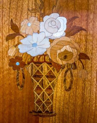 Verwendete Holzarten: Rosen- und Veilchenholz, Palisander, Buchsbaum, Birne, Pflaume, Buche, Nussbaum, Kirschbaum und Mahagoni.