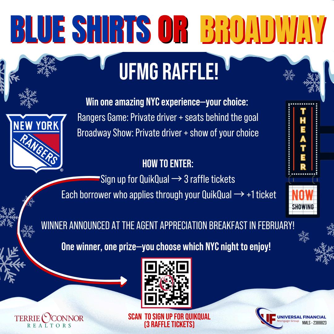 We’re kicking off our “Broadway or Blue Shirts” Universal Financial Mortgage Group Raffle, and the prize is next-levelAMAZING!