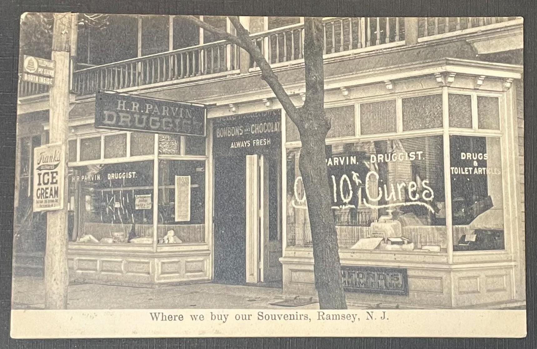 H.R. Parvin, Druggist as the store appeared on Main Street in 1908. Also called a pharmacy, by 1900 such establishments stocked their shelves, at least in part, with prefabricated medicines mass produced by what would become the pharmaceutical industry, whereas earlier they would largely be produced by an individual pharmacist. Thus the role shifted from one of being a producer of medicines to a dispenser of them. The postcard indicates Parvin's is 'where we buy our souvenirs', and unsurprisingly the name Parvin appears on the back of many early postcards. The advertisements in front include one for '10 cent cures', bonbons and chocolates, and 'Frank's Ice Cream' on the pole out front. Above the advertisement for ice cream is a sign indicating a phone booth is inside with the 'Bell system' logo. The original Parvin's postal window is on display in the Old Stone House.