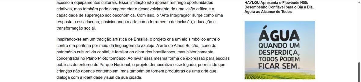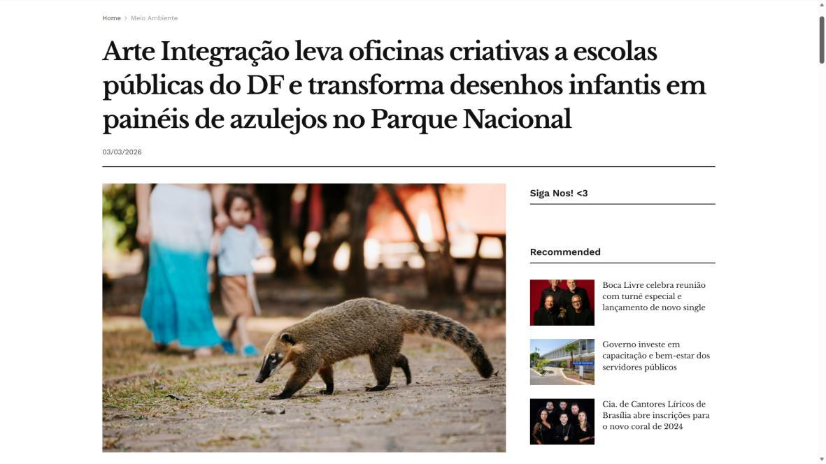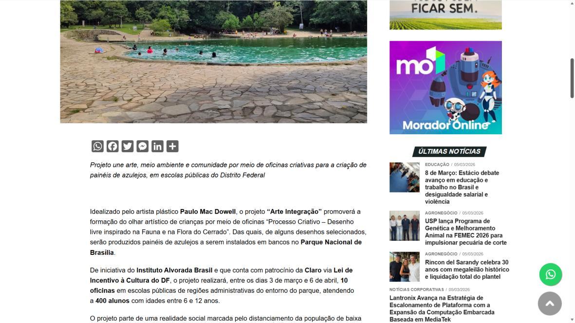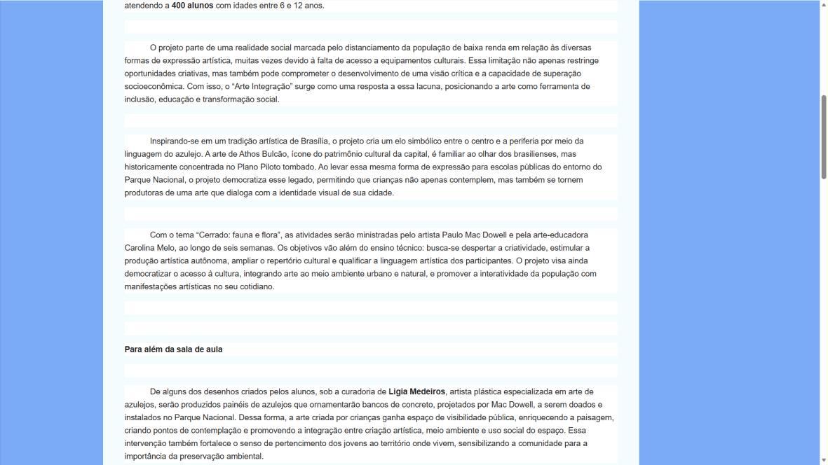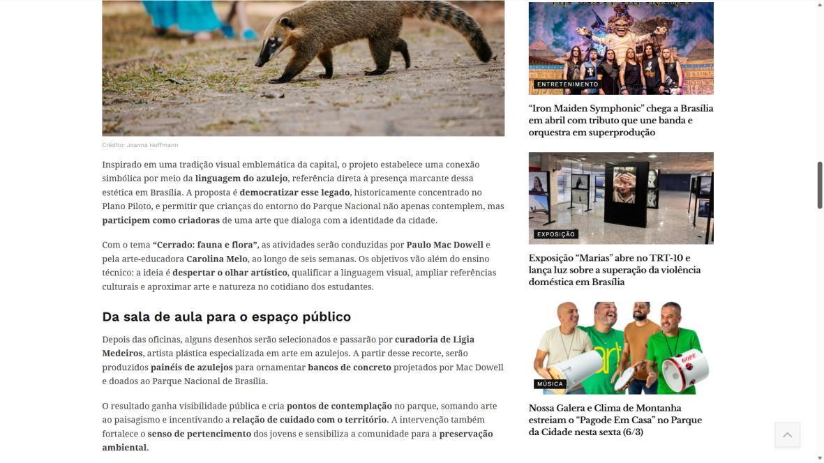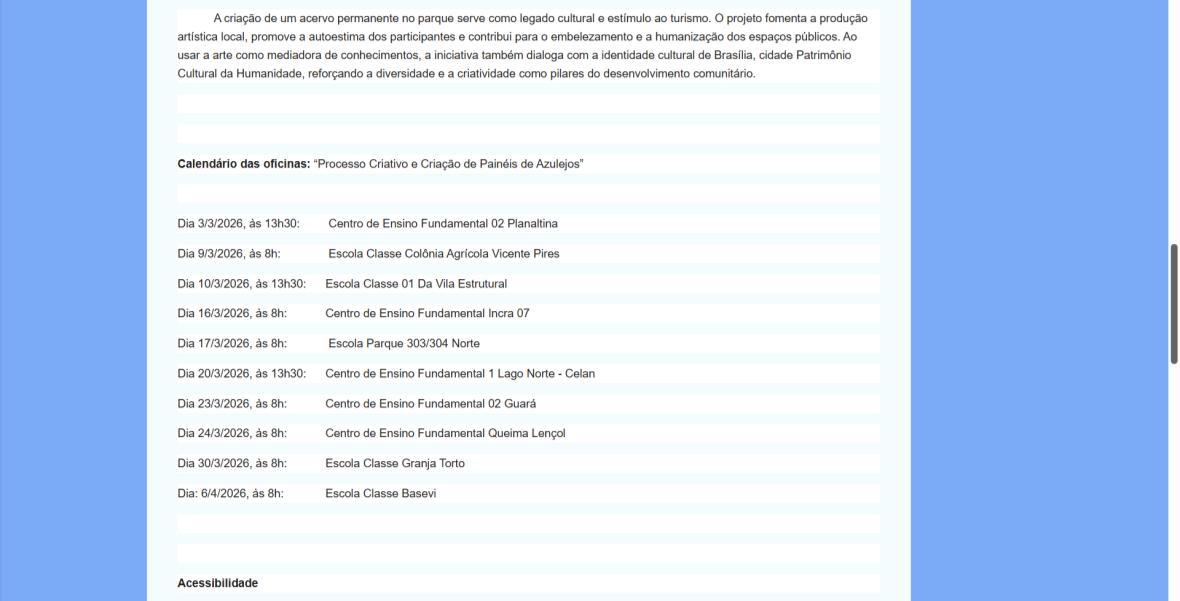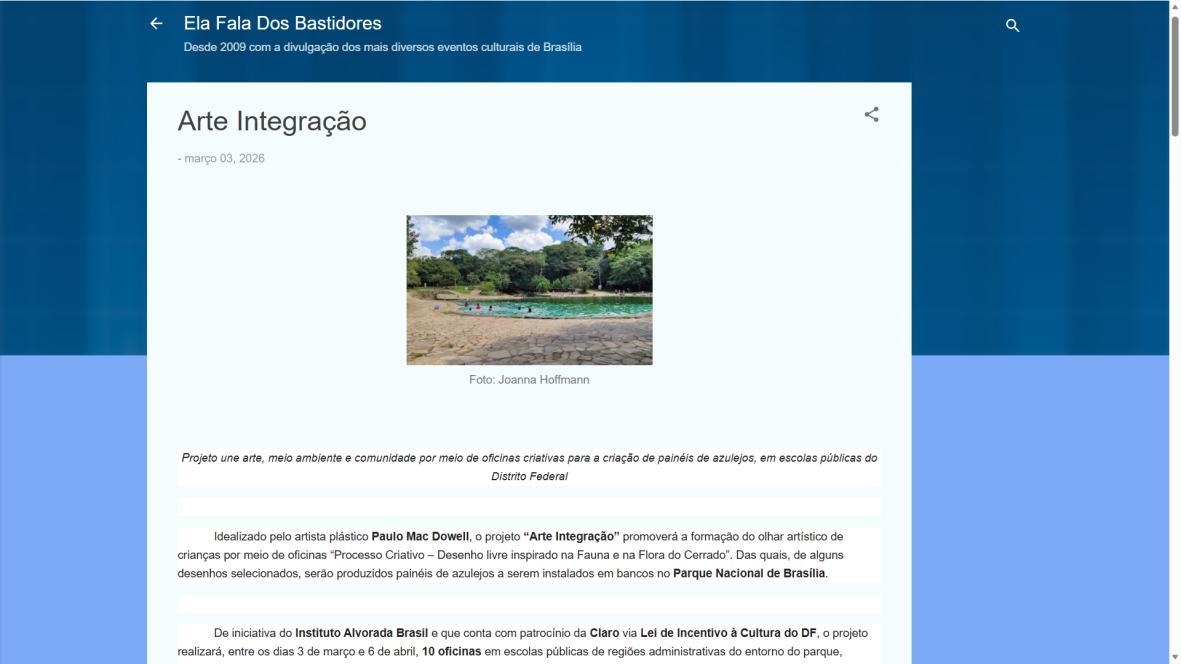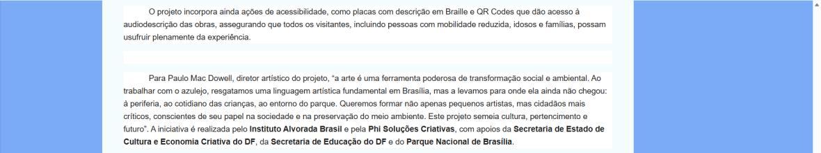 Para Paulo Mac Dowell, diretor artístico do projeto, “a arte é uma ferramenta poderosa de transformação social e ambiental. Ao trabalhar com o azulejo, resgatamos uma linguagem artística fundamental em Brasília, mas a levamos para onde ela ainda não chegou: à periferia, ao cotidiano das crianças, ao entorno do parque. Queremos formar não apenas pequenos artistas, mas cidadãos mais críticos, conscientes de seu papel na sociedade e na preservação do meio ambiente. Este projeto semeia cultura, pertencimento e futuro”. A iniciativa é realizada pelo Instituto Alvorada Brasil e pela Phi Soluções Criativas, com apoios da Secretaria de Estado de Cultura e Economia Criativa do DF, da Secretaria de Educação do DF e do Parque Nacional de Brasília.
