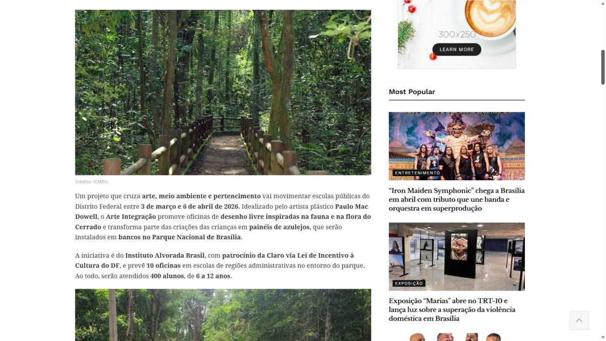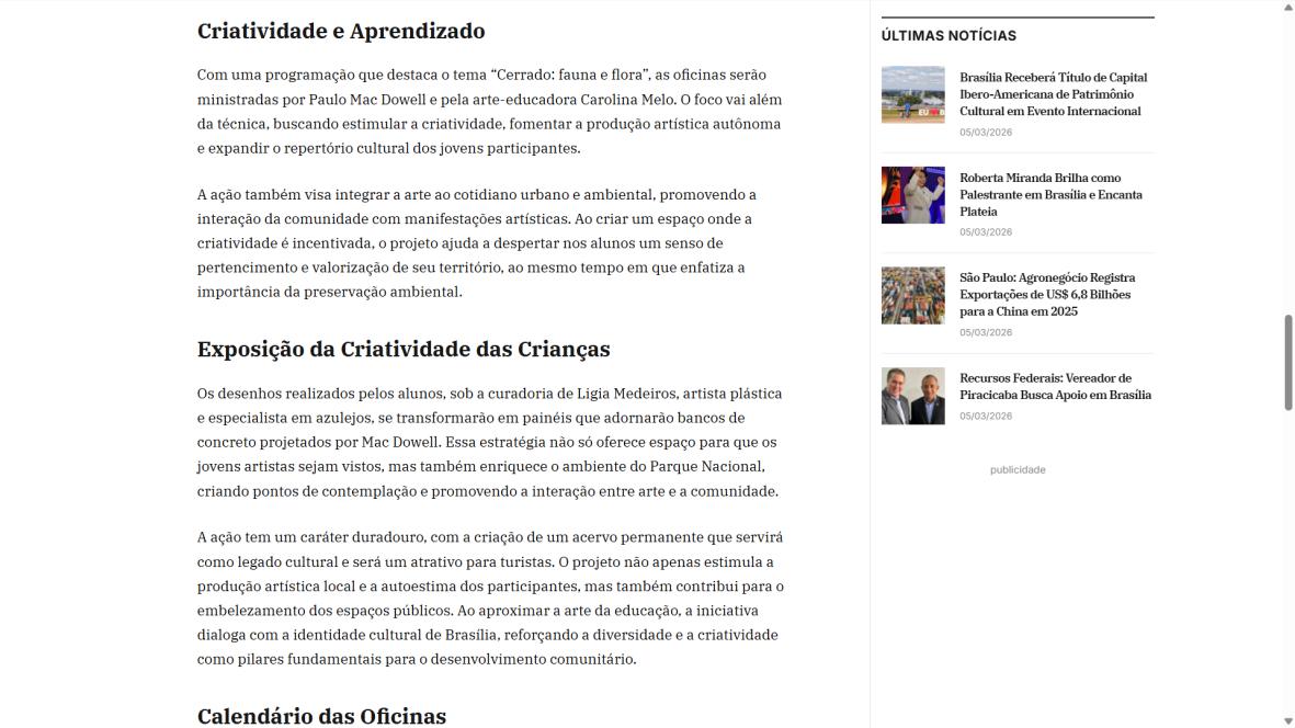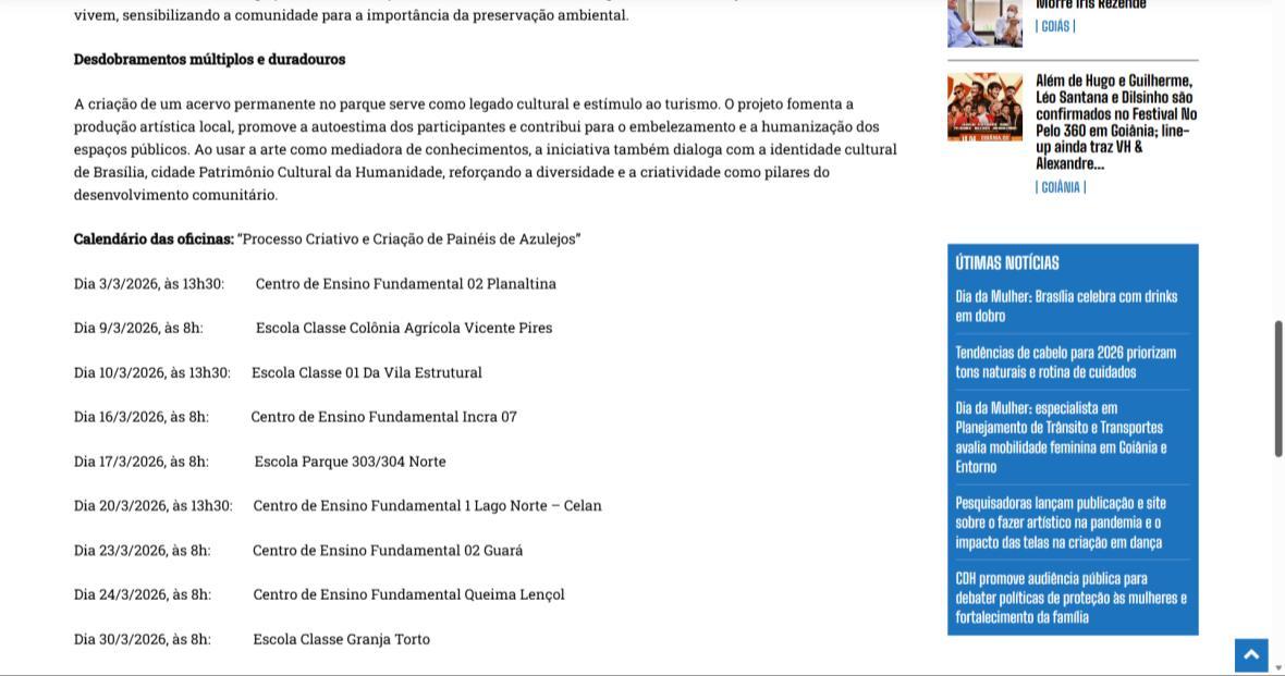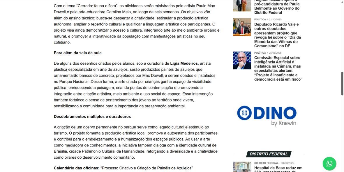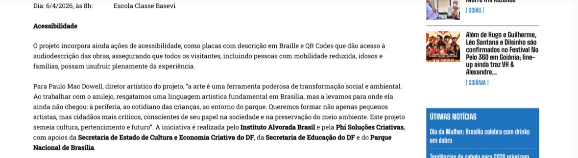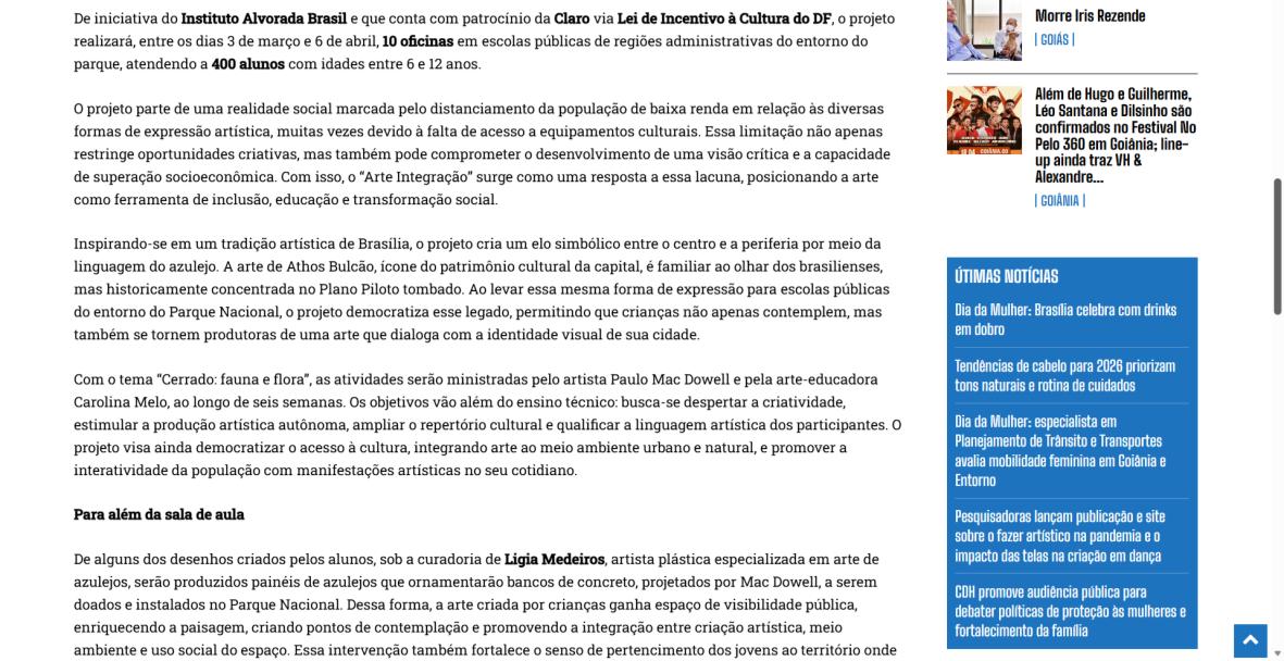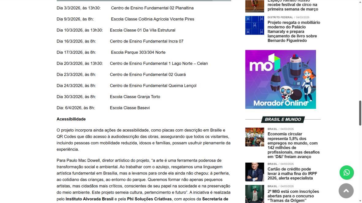 Para Paulo Mac Dowell, diretor artístico do projeto, “a arte é uma ferramenta poderosa de transformação social e ambiental. Ao trabalhar com o azulejo, resgatamos uma linguagem artística fundamental em Brasília, mas a levamos para onde ela ainda não chegou: à periferia, ao cotidiano das crianças, ao entorno do parque. Queremos formar não apenas pequenos artistas, mas cidadãos mais críticos, conscientes de seu papel na sociedade e na preservação do meio ambiente. Este projeto semeia cultura, pertencimento e futuro”. A iniciativa é realizada pelo Instituto Alvorada Brasil e pela Phi Soluções Criativas, com apoios da Secretaria de Estado de Cultura e Economia Criativa do DF, da Secretaria de Educação do DF e do Parque Nacional de Brasília.