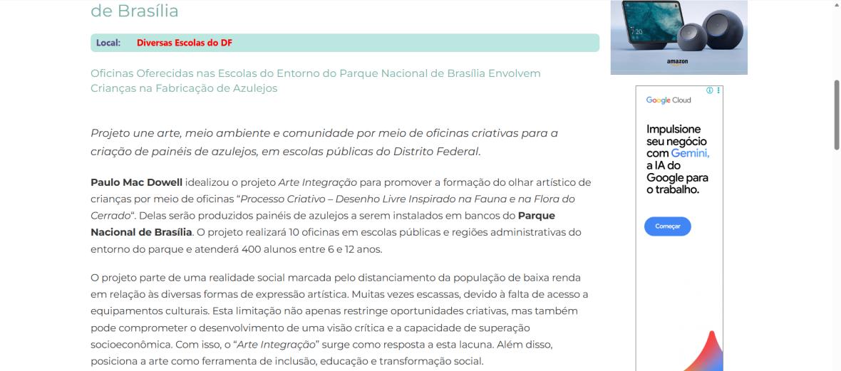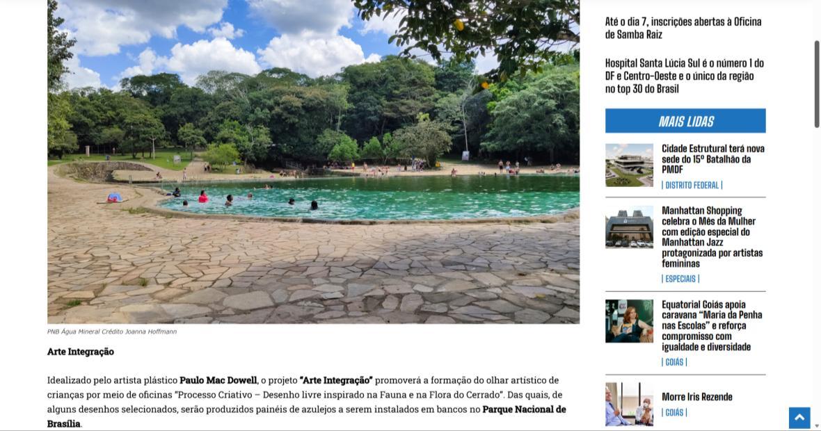 Idealizado pelo artista plástico Paulo Mac Dowell, o projeto “Arte Integração” promoverá a formação do olhar artístico de crianças por meio de oficinas “Processo Criativo – Desenho livre inspirado na Fauna e na Flora do Cerrado”. Das quais, de alguns desenhos selecionados, serão produzidos painéis de azulejos a serem instalados em bancos no Parque Nacional de Brasília