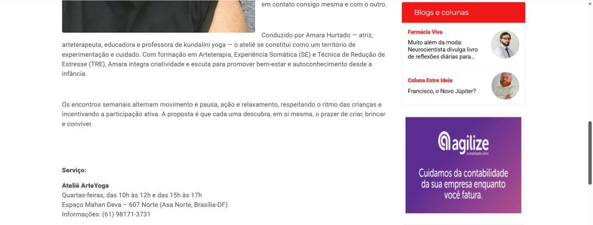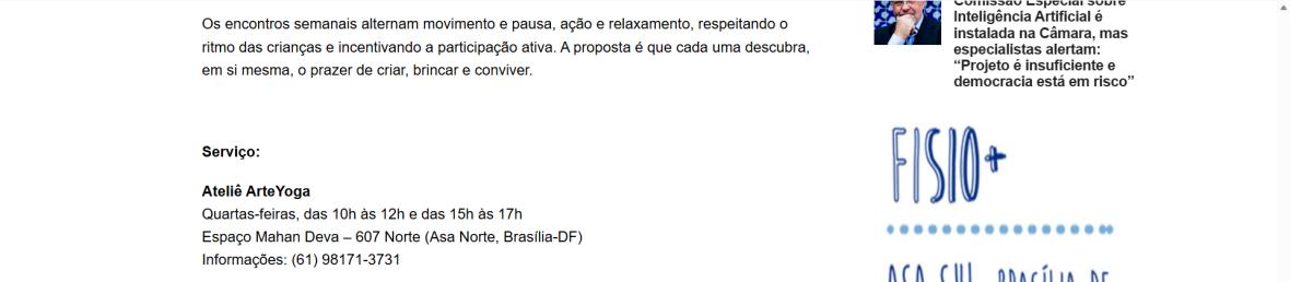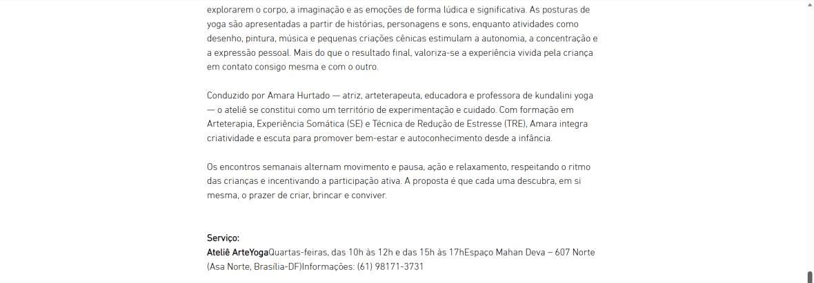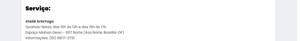 Serviço: Ateliê ArteYoga Quartas-feiras, das 10h às 12h e das 15h às 17h Espaço Mahan Deva – 607 Norte (Asa Norte, Brasília-DF) Informações: (61) 98171-3731