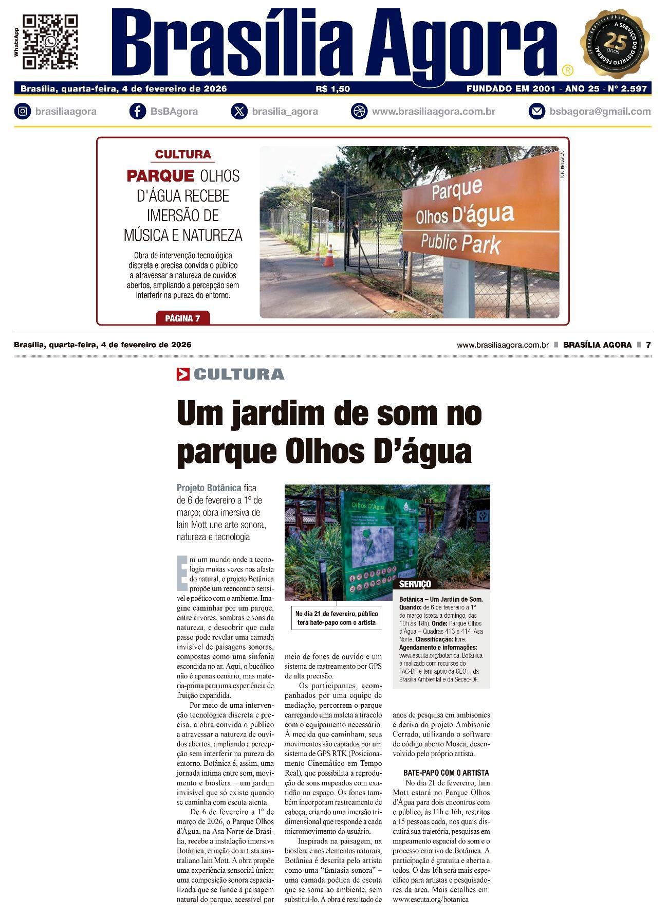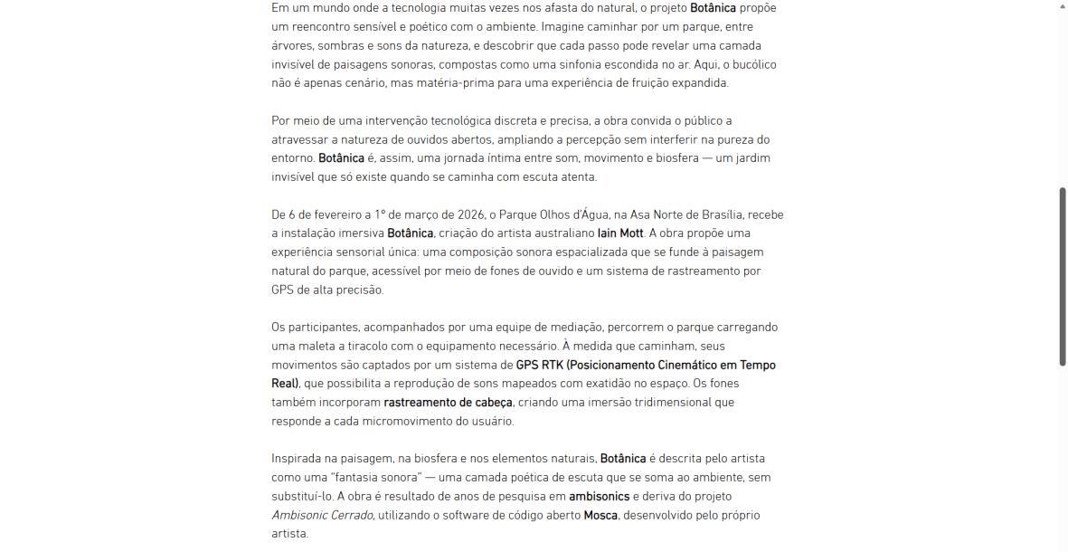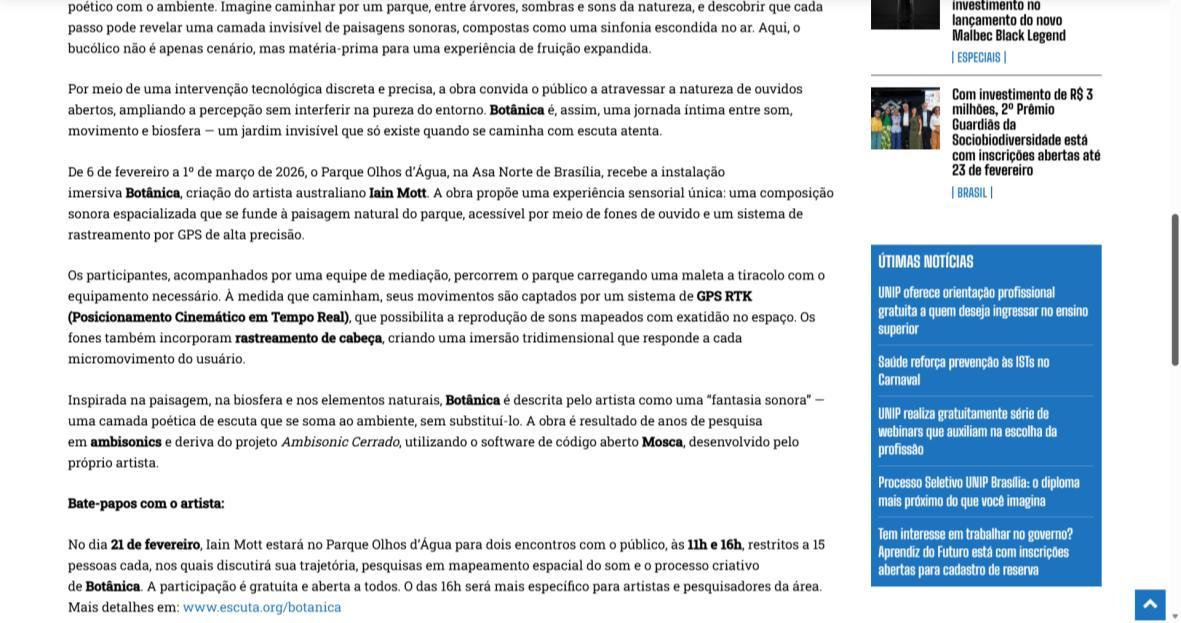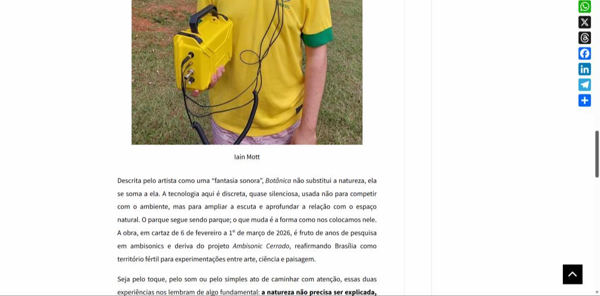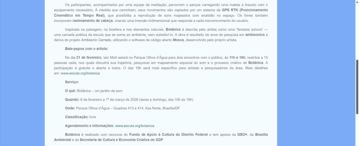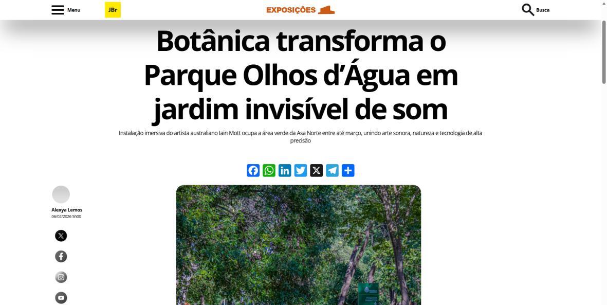De 6 de fevereiro a 1º de março de 2026, o Parque Olhos d’Água, na Asa Norte de Brasília, recebe a instalação imersiva Botânica, criação do artista australiano Iain Mott. A obra propõe uma experiência sensorial única: uma composição sonora espacializada que se funde à paisagem natural do parque, acessível por meio de fones de ouvido e um sistema de rastreamento por GPS de alta precisão.