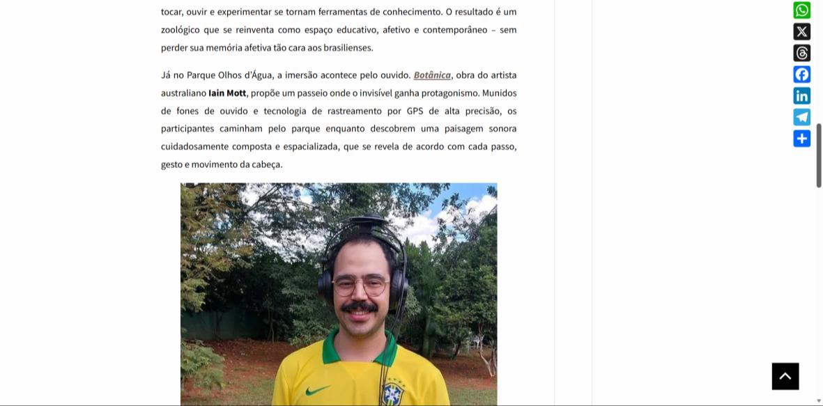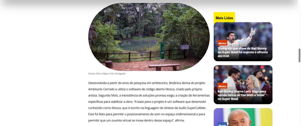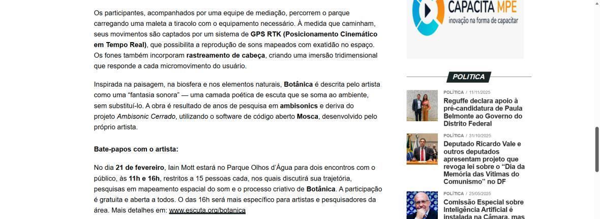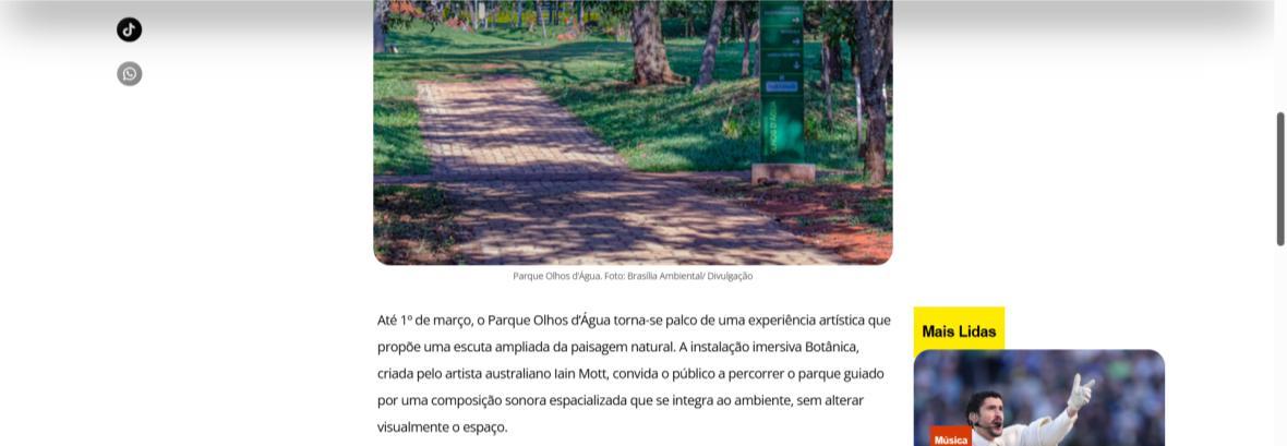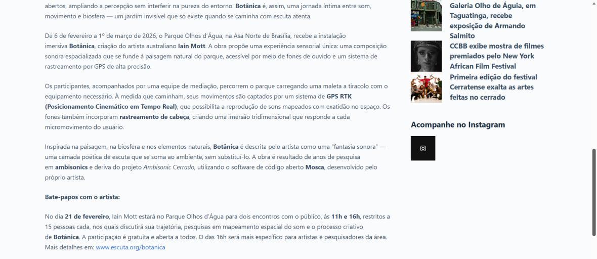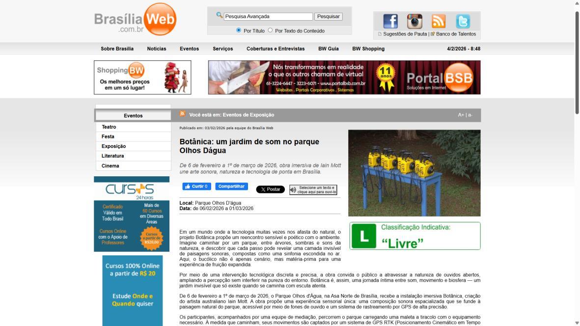 De 6 de fevereiro a 1º de março de 2026, o Parque Olhos d’Água, na Asa Norte de Brasília, recebe a instalação imersiva Botânica, criação do artista australiano Iain Mott. A obra propõe uma experiência sensorial única: uma composição sonora espacializada que se funde à paisagem natural do parque, acessível por meio de fones de ouvido e um sistema de rastreamento por GPS de alta precisão.