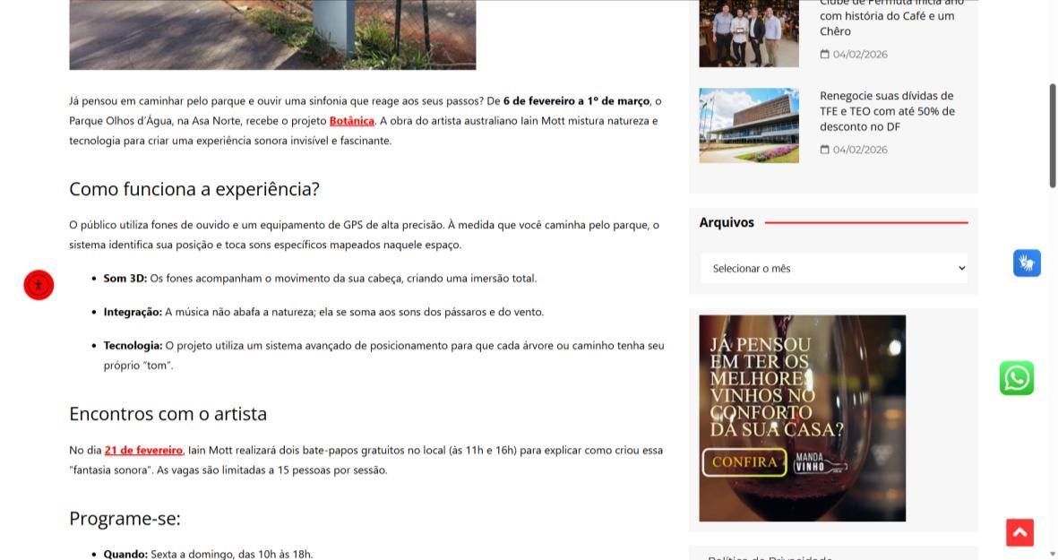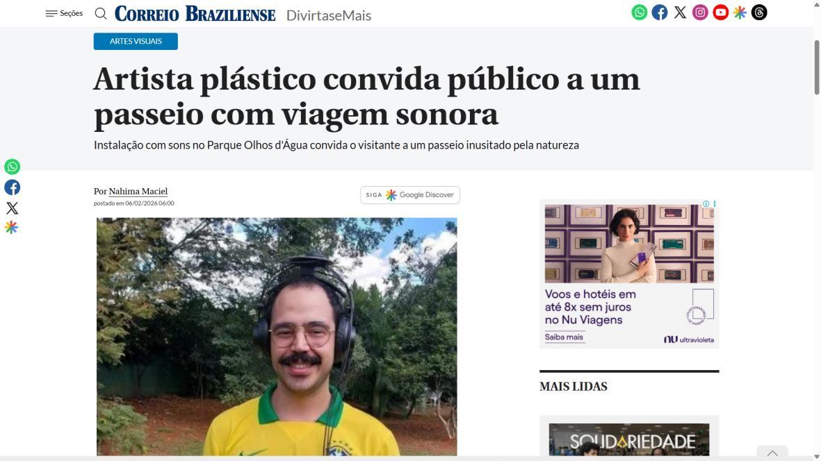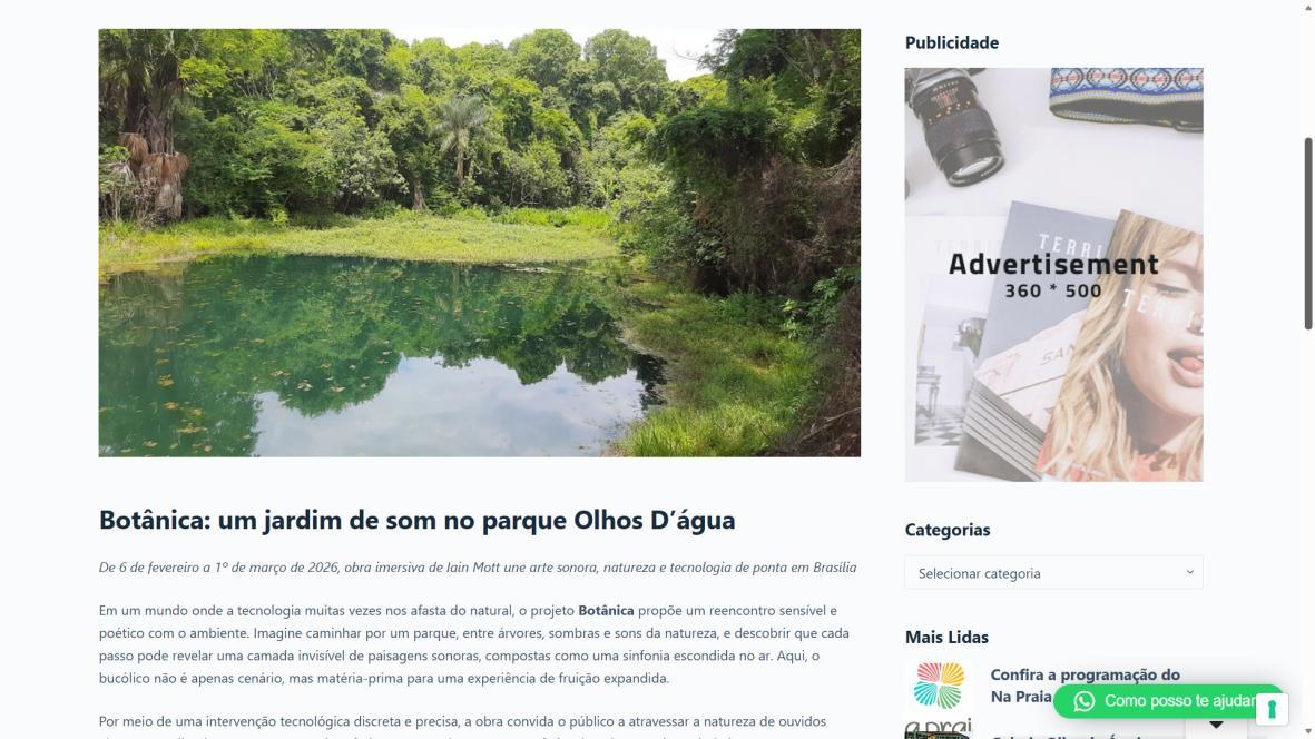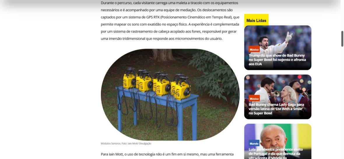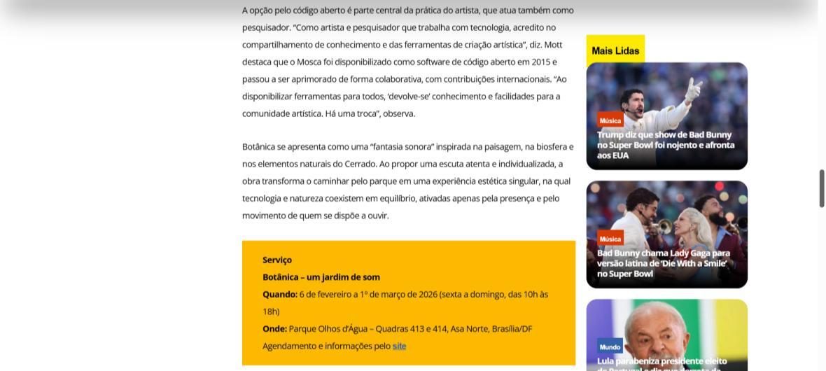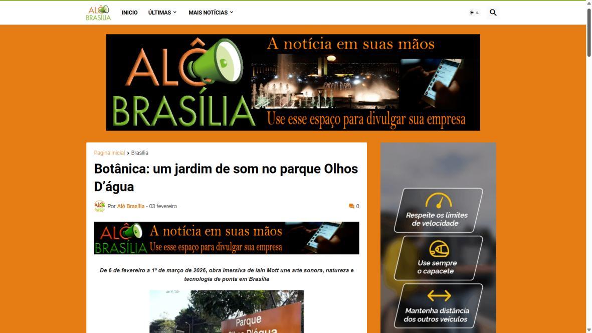 De 6 de fevereiro a 1º de março de 2026, o Parque Olhos d’Água, na Asa Norte de Brasília, recebe a instalação imersiva Botânica, criação do artista australiano Iain Mott. A obra propõe uma experiência sensorial única: uma composição sonora espacializada que se funde à paisagem natural do parque, acessível por meio de fones de ouvido e um sistema de rastreamento por GPS de alta precisão.