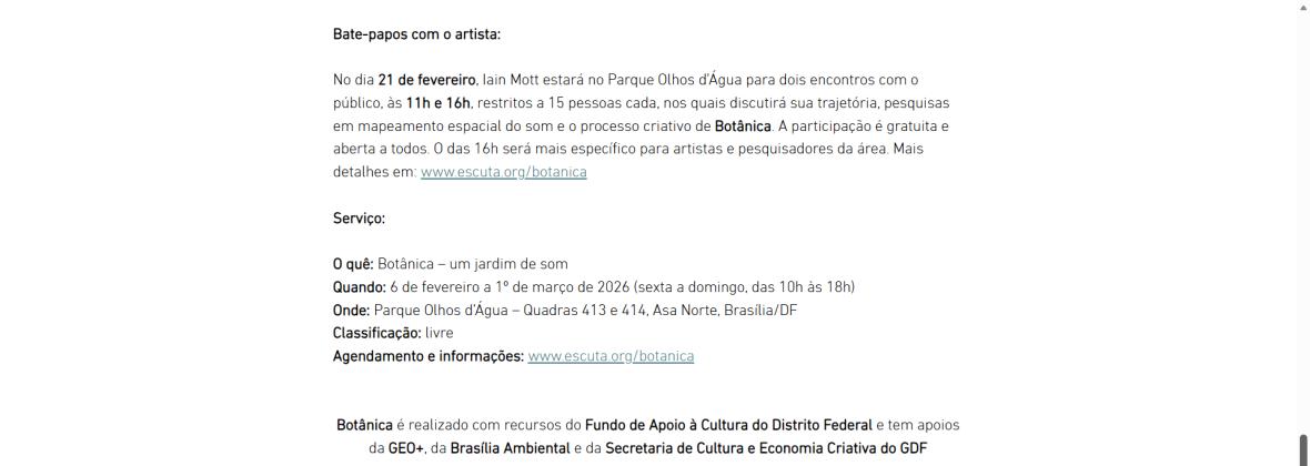 No dia 21 de fevereiro, Iain Mott estará no Parque Olhos d’Água para dois encontros com o público, às 11h e 16h, restritos a 15 pessoas cada, nos quais discutirá sua trajetória, pesquisas em mapeamento espacial do som e o processo criativo de Botânica. A participação é gratuita e aberta a todos. O das 16h será mais específico para artistas e pesquisadores da área. Mais detalhes em: www.escuta.org/botanica