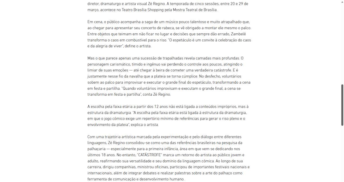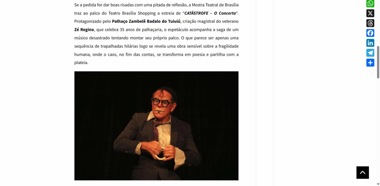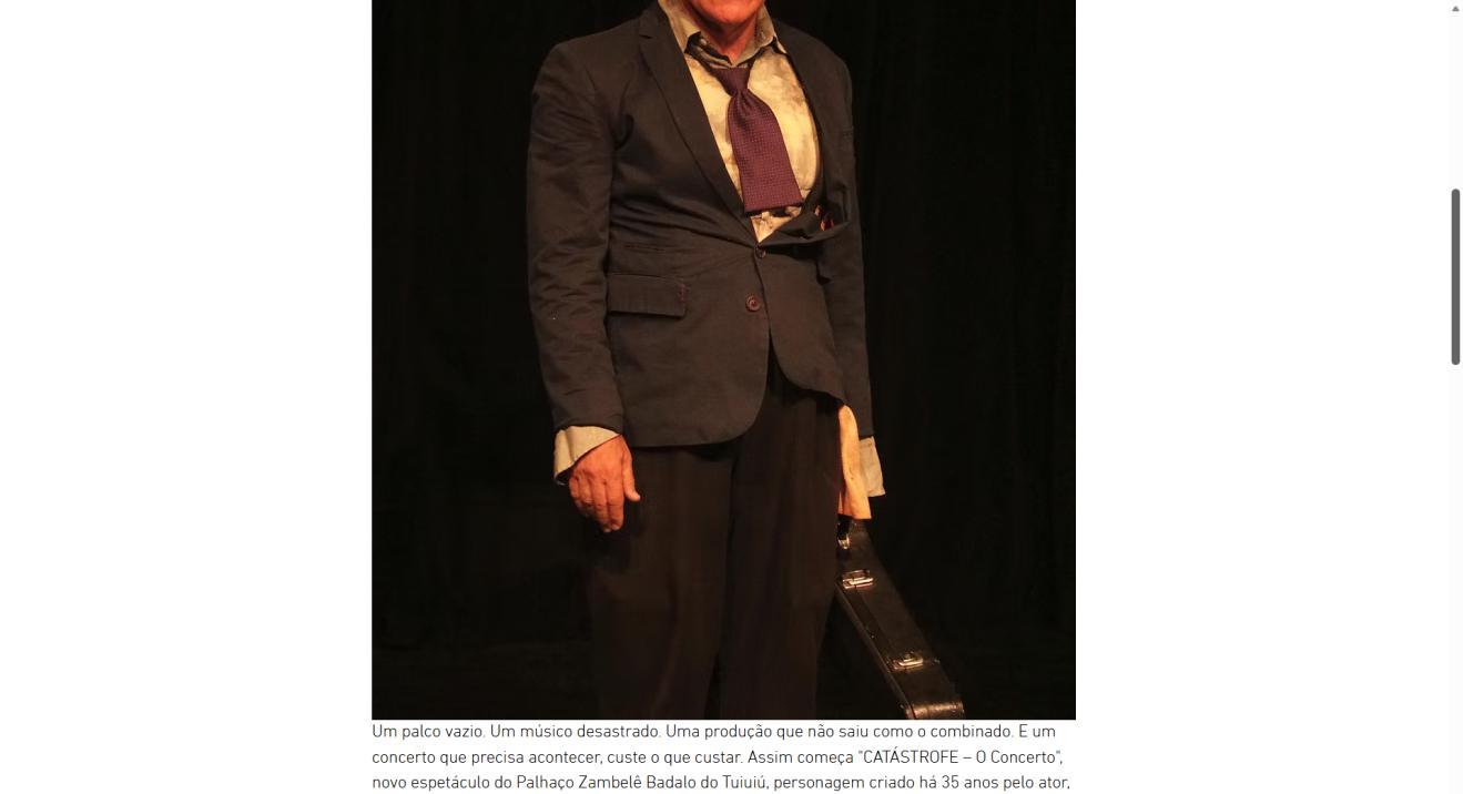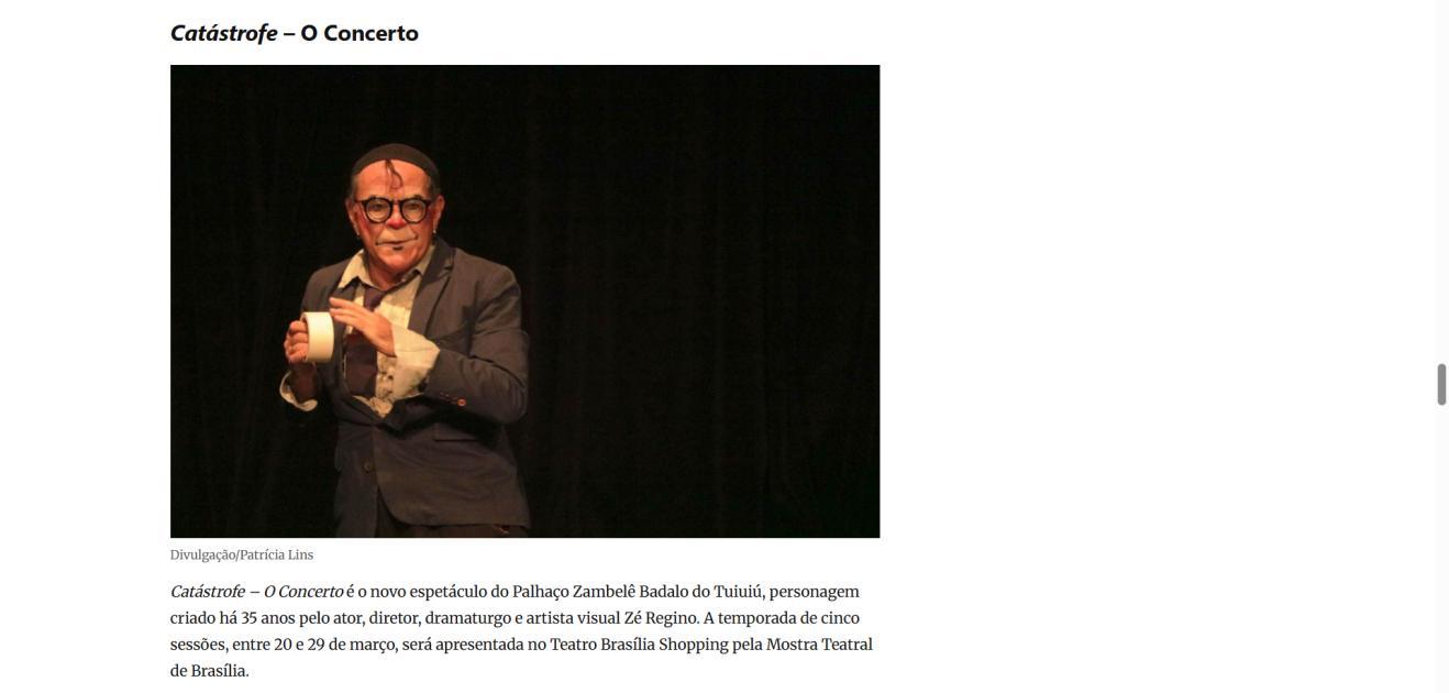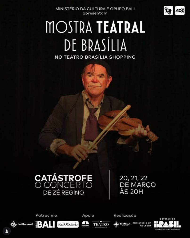 Um palco vazio. Um músico desastrado. Uma produção que não saiu como o combinado. E um concerto que precisa acontecer, custe o que custar. Assim começa "CATÁSTROFE – O Concerto", novo espetáculo do Palhaço Zambelê Badalo do Tuiuiú, personagem criado há 35 anos pelo ator, diretor, dramaturgo e artista visual Zé Regino. A temporada de cinco sessões, entre 20 e 29 de março, acontece no Teatro Brasília Shopping pela Mostra Teatral de Brasília.