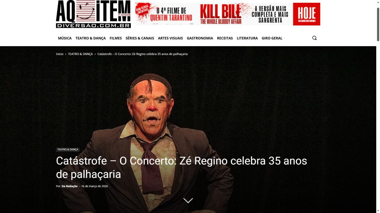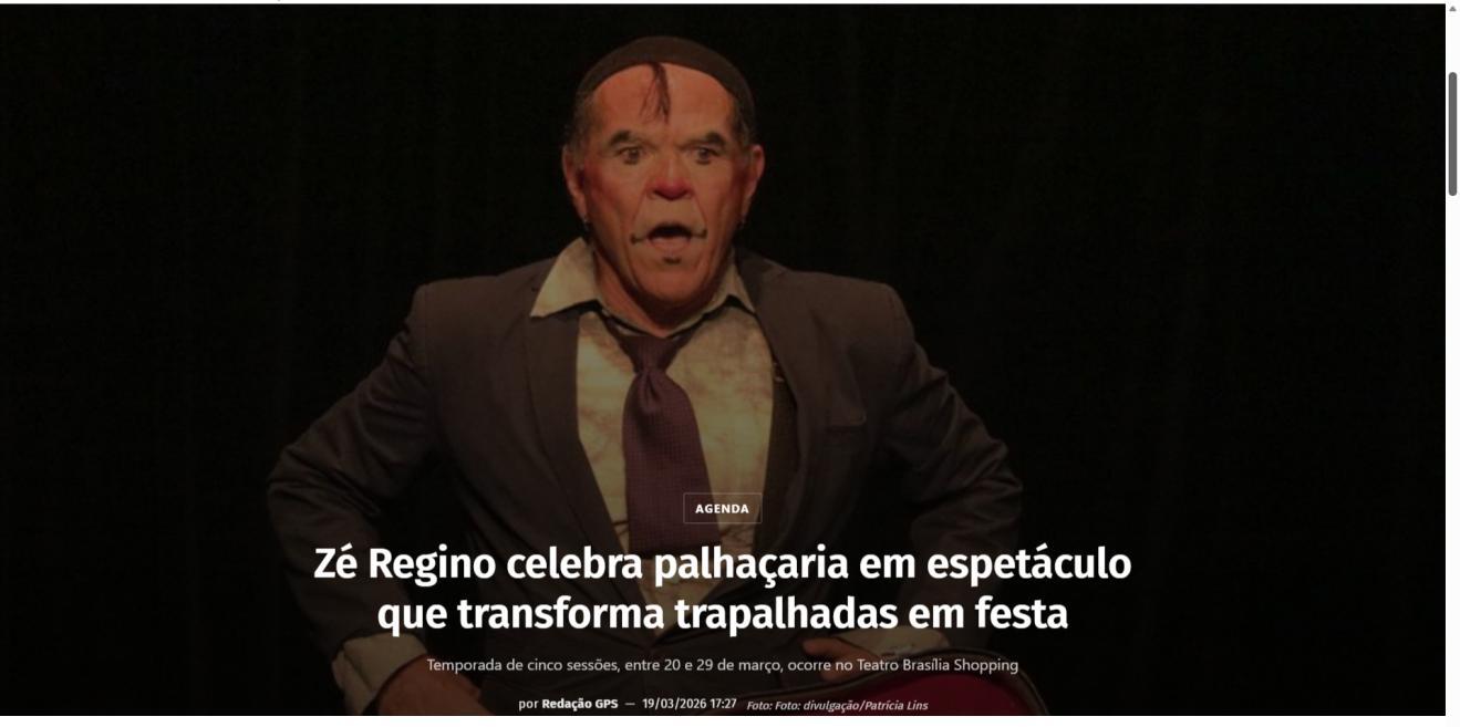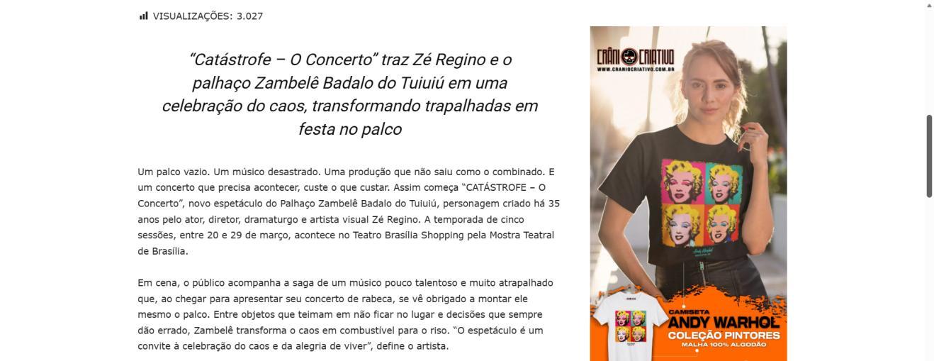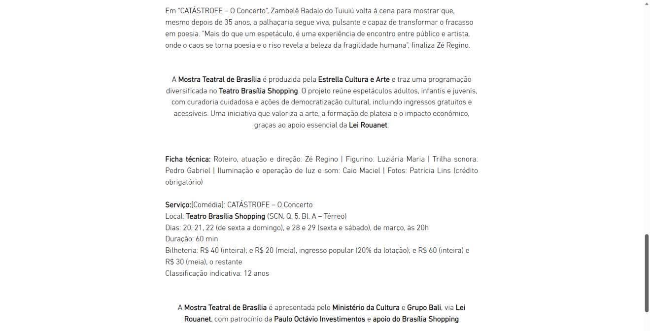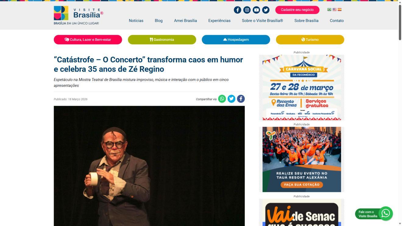 Um palco vazio. Um músico desastrado. Uma produção que não saiu como o combinado. E um concerto que precisa acontecer, custe o que custar. Assim começa "CATÁSTROFE – O Concerto", novo espetáculo do Palhaço Zambelê Badalo do Tuiuiú, personagem criado há 35 anos pelo ator, diretor, dramaturgo e artista visual Zé Regino. A temporada de cinco sessões, entre 20 e 29 de março, acontece no Teatro Brasília Shopping pela Mostra Teatral de Brasília.
