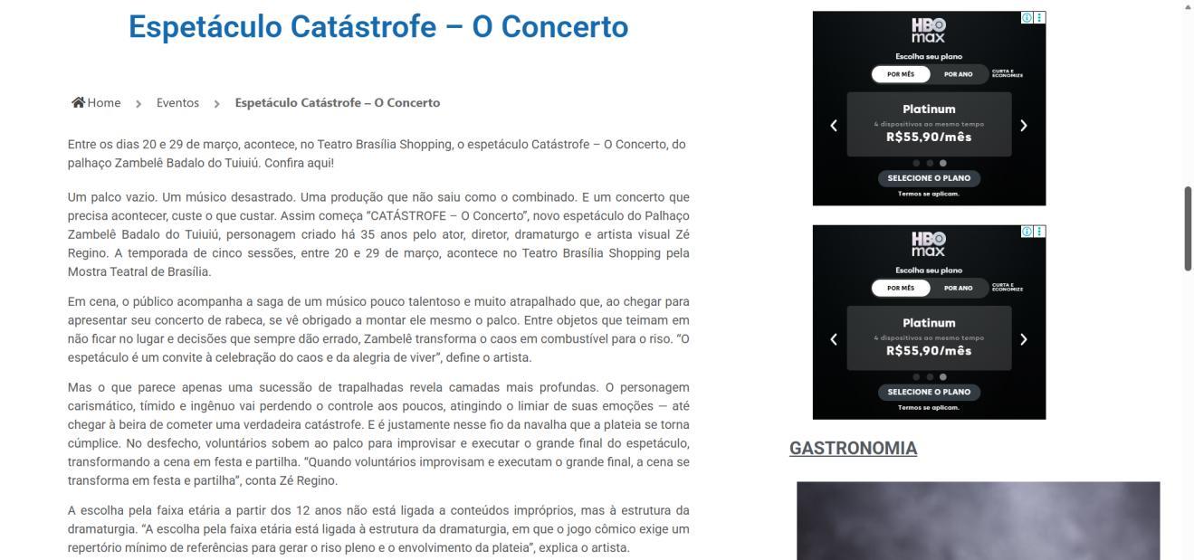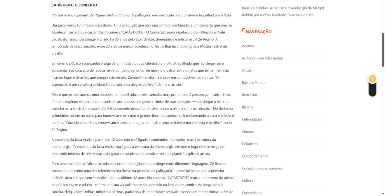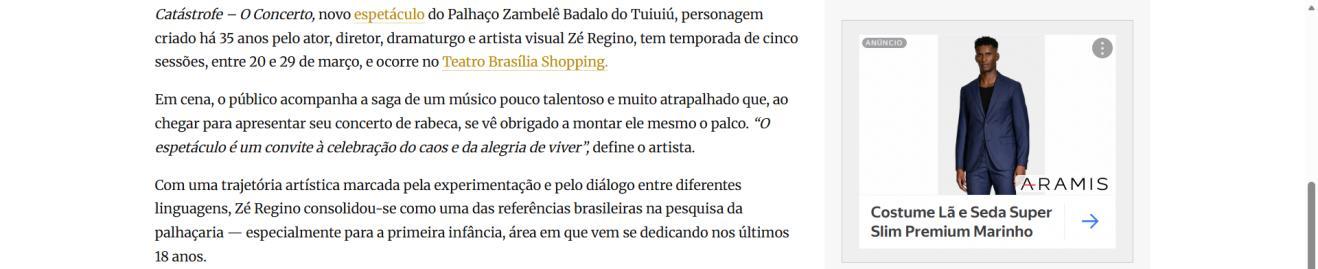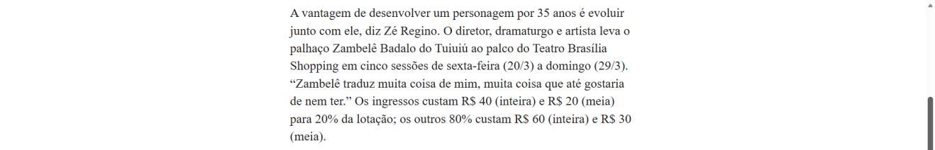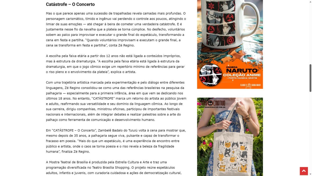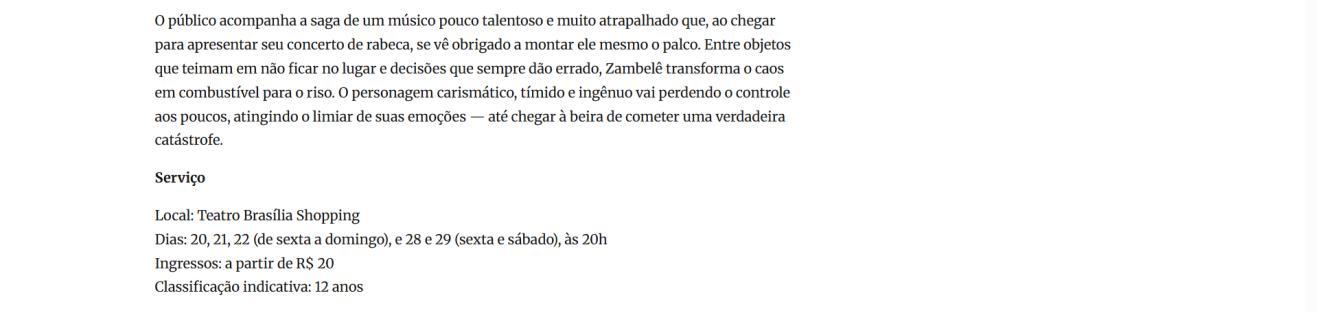 Um palco vazio. Um músico desastrado. Uma produção que não saiu como o combinado. E um concerto que precisa acontecer, custe o que custar. Assim começa "CATÁSTROFE – O Concerto", novo espetáculo do Palhaço Zambelê Badalo do Tuiuiú, personagem criado há 35 anos pelo ator, diretor, dramaturgo e artista visual Zé Regino. A temporada de cinco sessões, entre 20 e 29 de março, acontece no Teatro Brasília Shopping pela Mostra Teatral de Brasília.