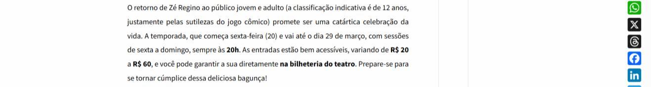 Mas o que parece apenas uma sucessão de trapalhadas revela camadas mais profundas. O personagem carismático, tímido e ingênuo vai perdendo o controle aos poucos, atingindo o limiar de suas emoções até chegar à beira de cometer uma verdadeira catástrofe. E é justamente nesse fio da navalha que a plateia se torna cúmplice. No desfecho, voluntários sobem ao palco para improvisar e executar o grande final do espetáculo, transformando a cena em festa e partilha. "Quando voluntários improvisam e executam o grande final, a cena se transforma em festa e partilha", conta Zé Regino.