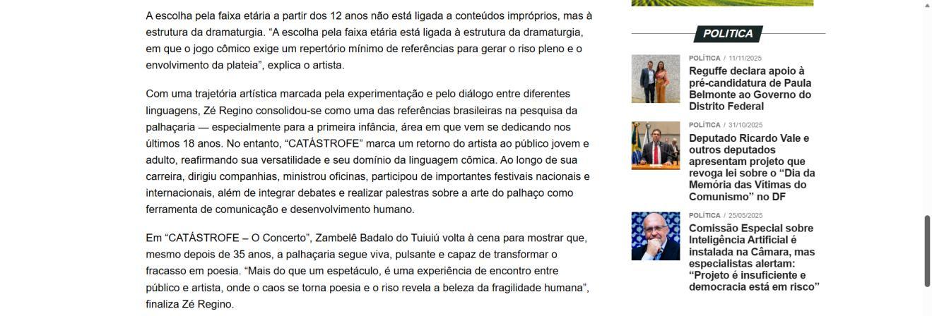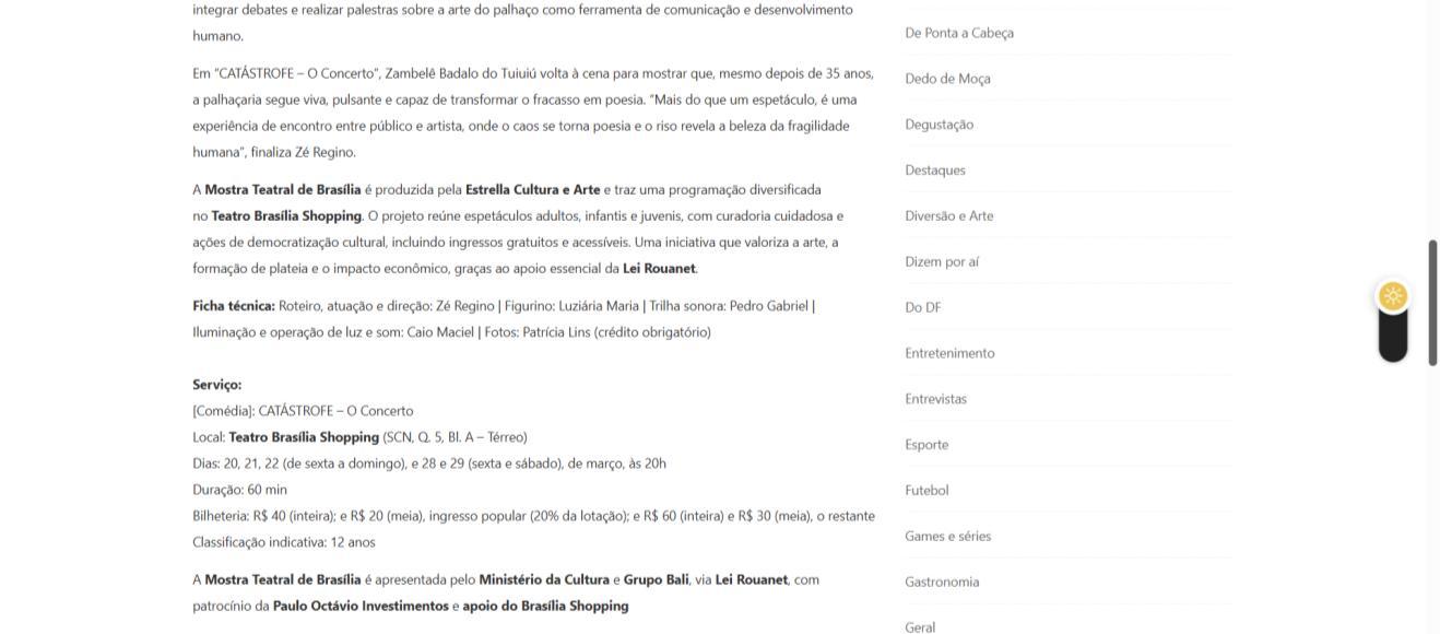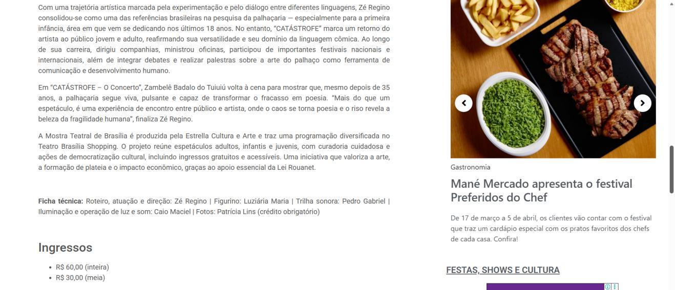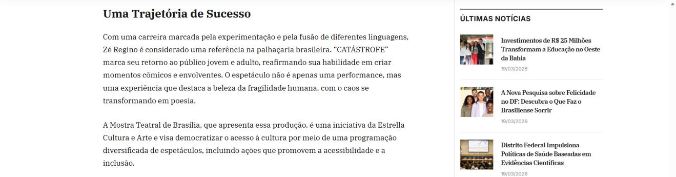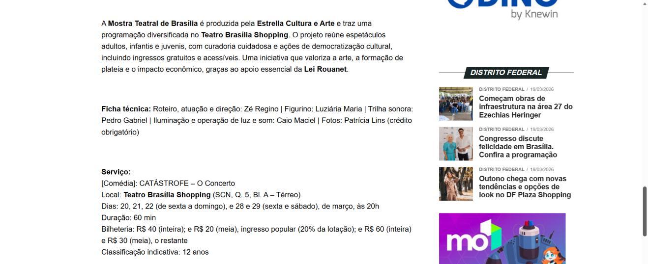 A Mostra Teatral de Brasília é produzida pela Estrella Cultura e Arte e traz uma programação diversificada no Teatro Brasília Shopping. O projeto reúne espetáculos adultos, infantis e juvenis, com curadoria cuidadosa e ações de democratização cultural, incluindo ingressos gratuitos e acessíveis. Uma iniciativa que valoriza a arte, a formação de plateia e o impacto econômico, graças ao apoio essencial da Lei Rouanet
