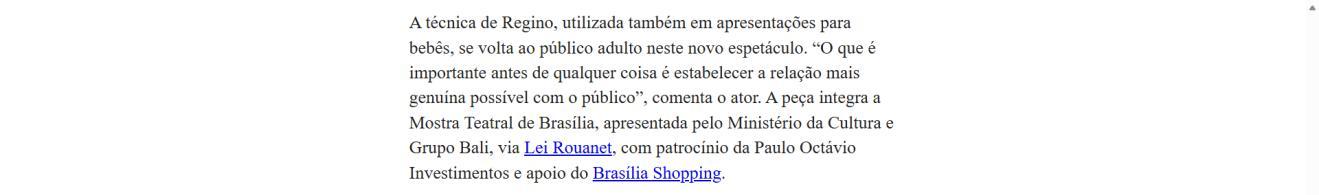 A Mostra Teatral de Brasília é apresentada pelo Ministério da Cultura e Grupo Bali, via Lei Rouanet, com patrocínio da Paulo Octávio Investimentos e apoio do Brasília Shopping