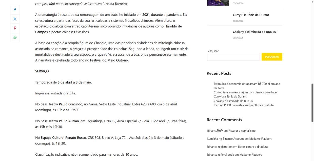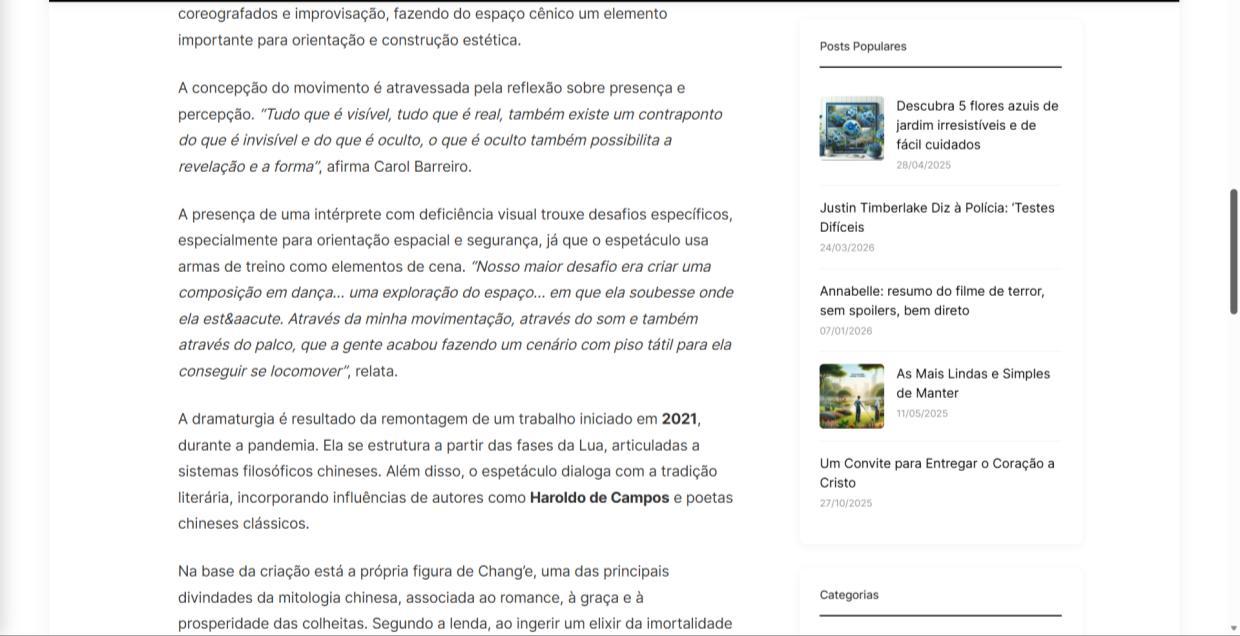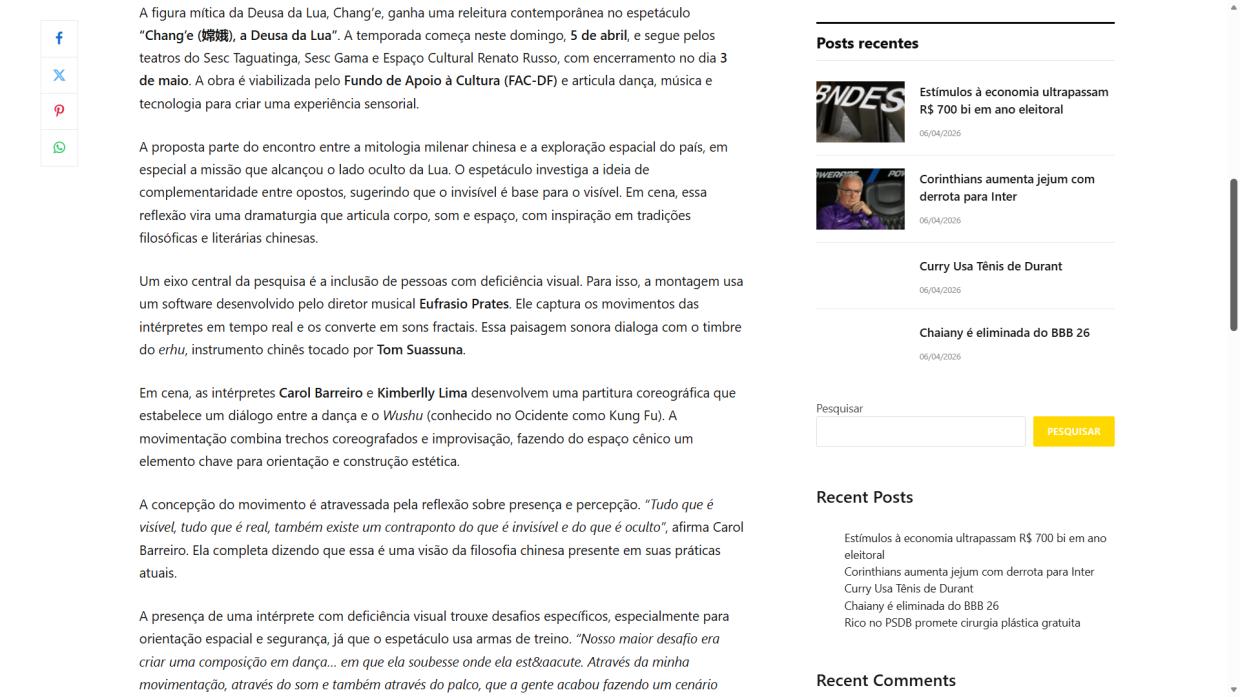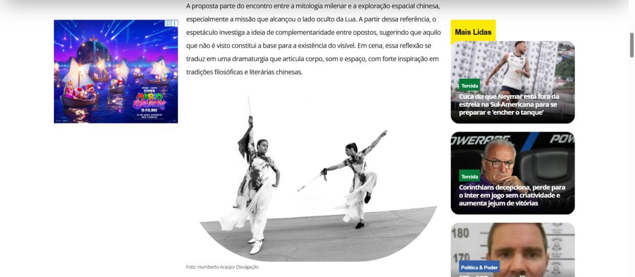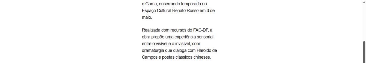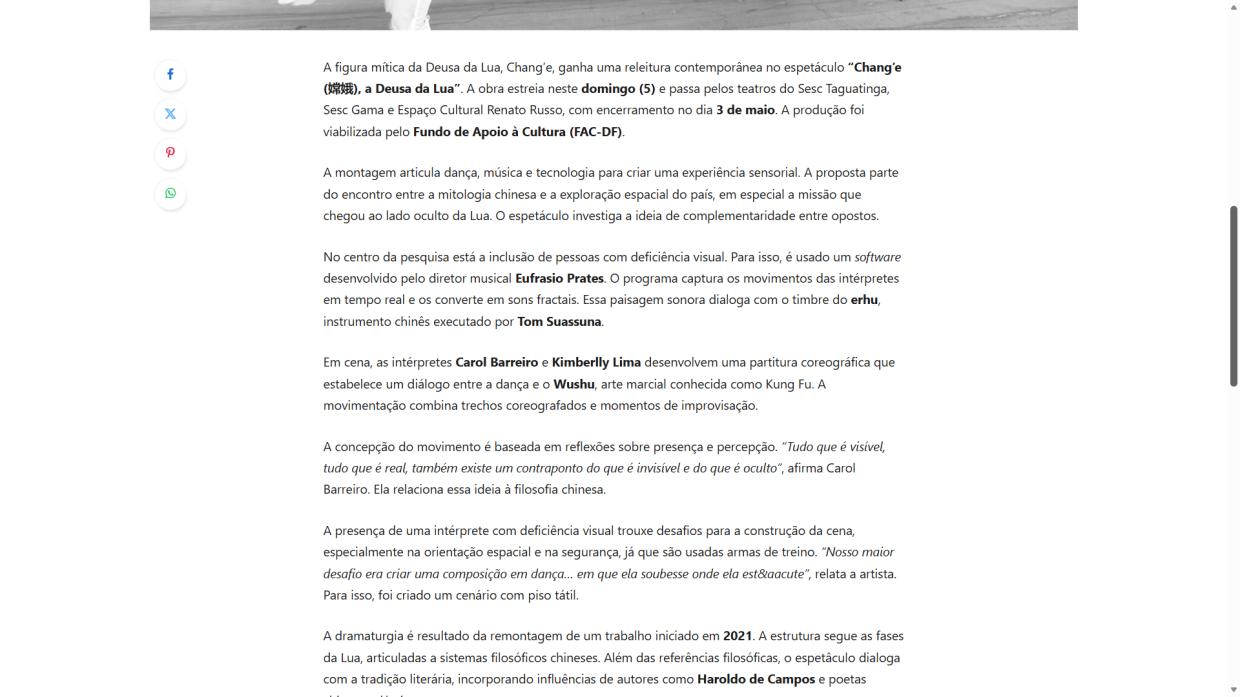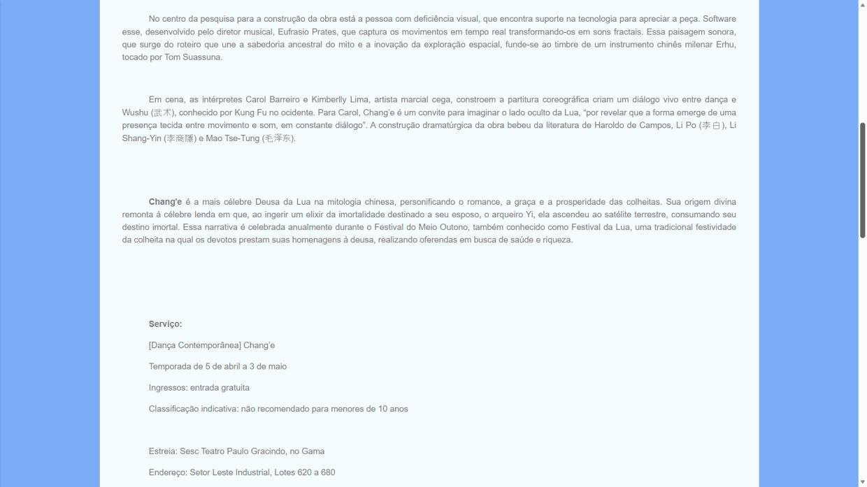 Do encontro entre a mitologia milenar da Deusa da Lua, Chang'e, e a exploração espacial, o espetáculo propõe uma experiência sensorial entre o visível e o invisível por meio da dança. Realizado com recursos do Fundo de Apoio à Cultura (FAC-DF), a obra foi inspirada na missão lunar chinesa que revelou o lado oculto da Lua e, ao resgatar a ideia de oposto complementar, propõe que o não visto não é vazio, mas sim a estrutura que permite a manifestação do visível.