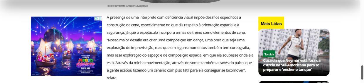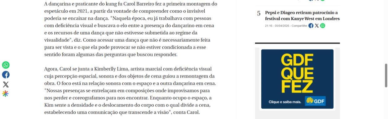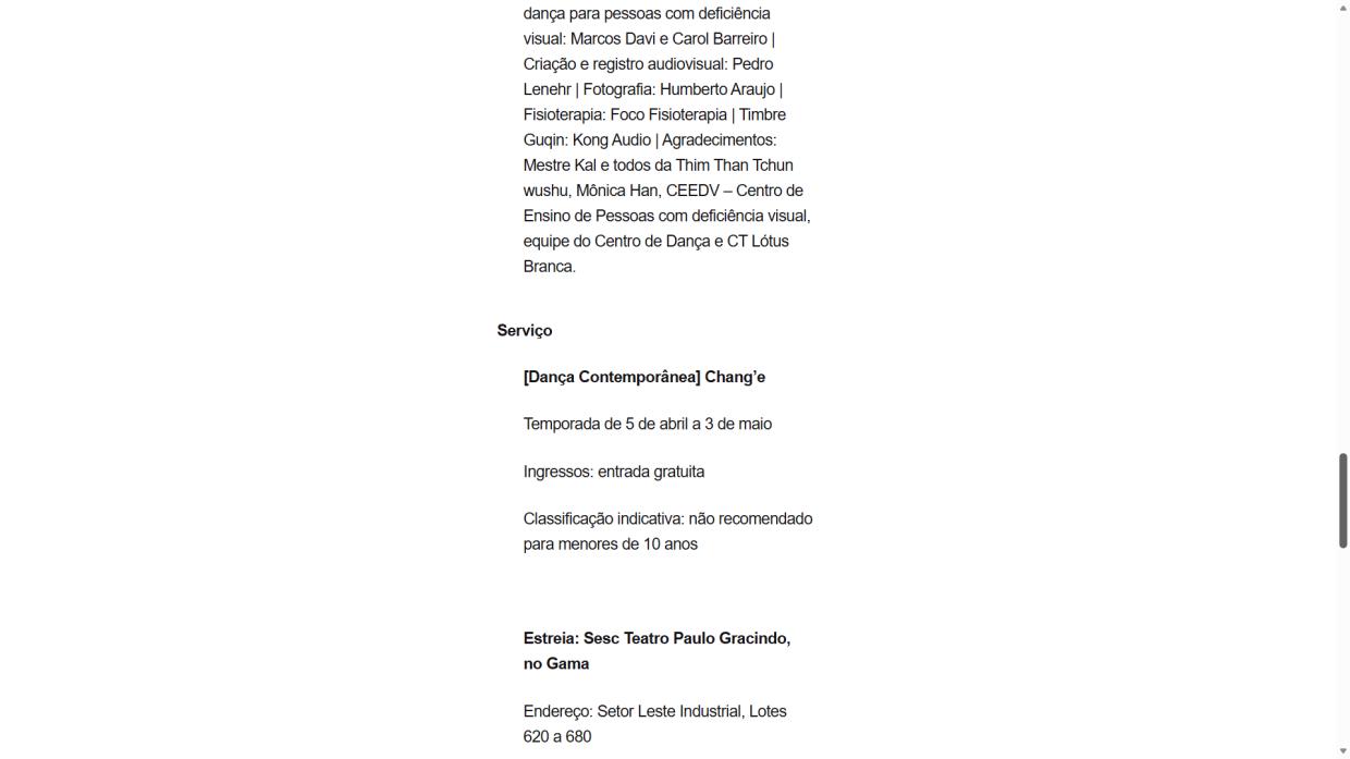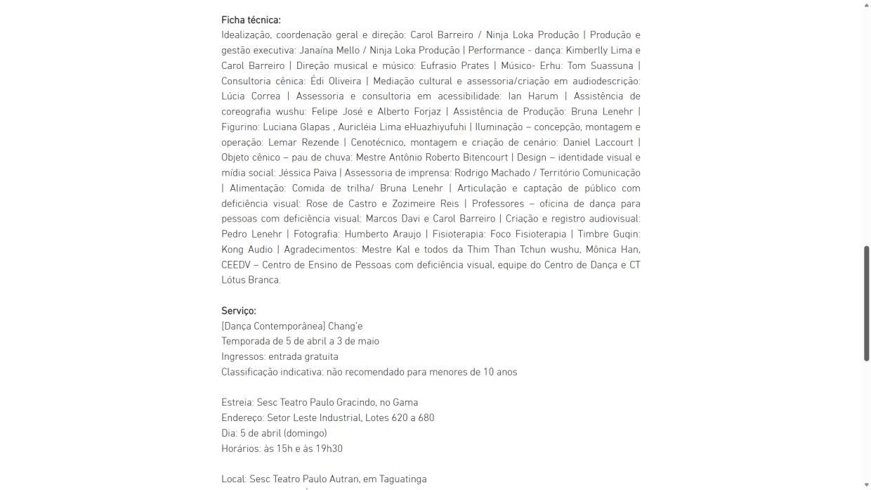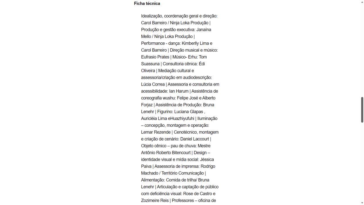 Bitencourt | Design – identidade visual e mídia social: Jéssica Paiva | Assessoria de imprensa: Rodrigo Machado / Território Comunicação | Alimentação: Comida de trilha/ Bruna Lenehr | Articulação e captação de público com deficiência visual: Rose de Castro e Zozimeire Reis | Professores – oficina de dança para pessoas com deficiência visual: Marcos Davi e Carol Barreiro | Criação e registro audiovisual: Pedro Lenehr | Fotografia: Humberto Araujo | Fisioterapia: Foco Fisioterapia | Timbre Guqin: Kong Audio |