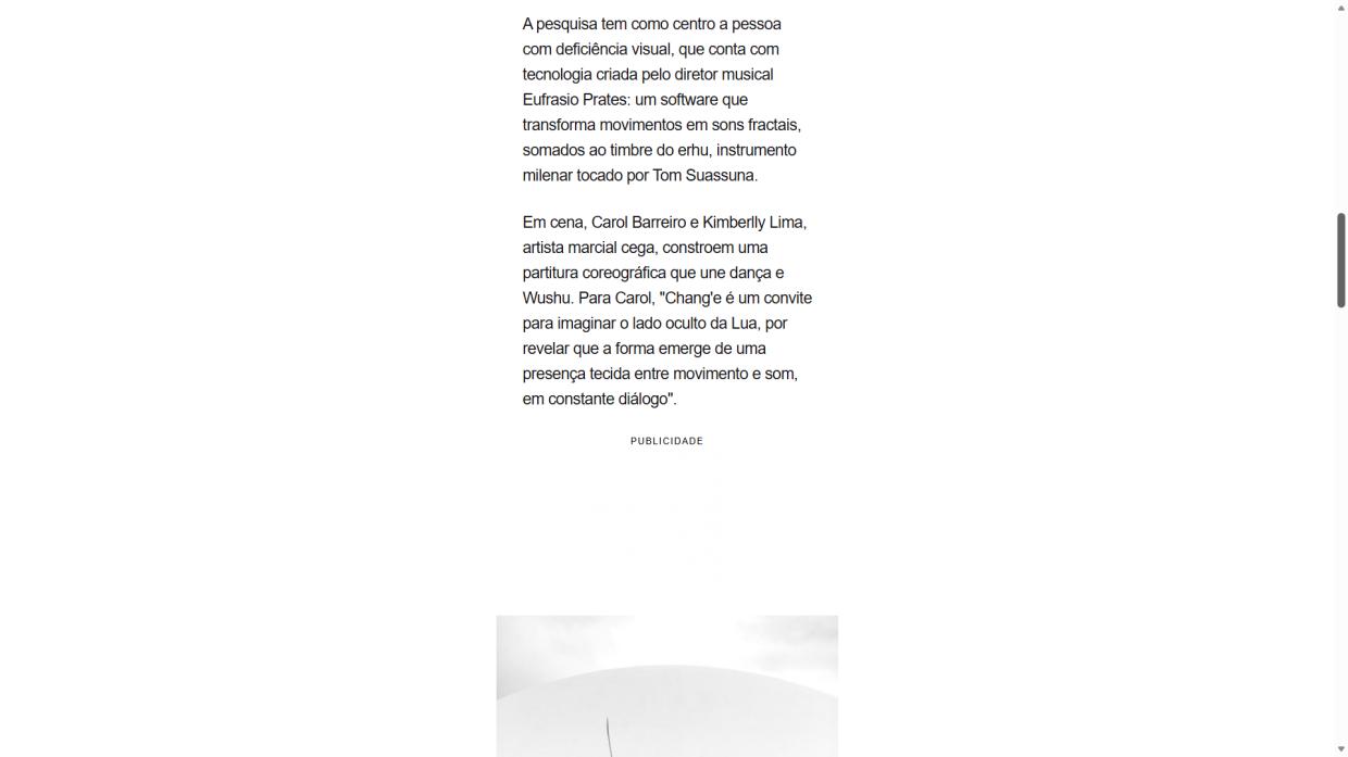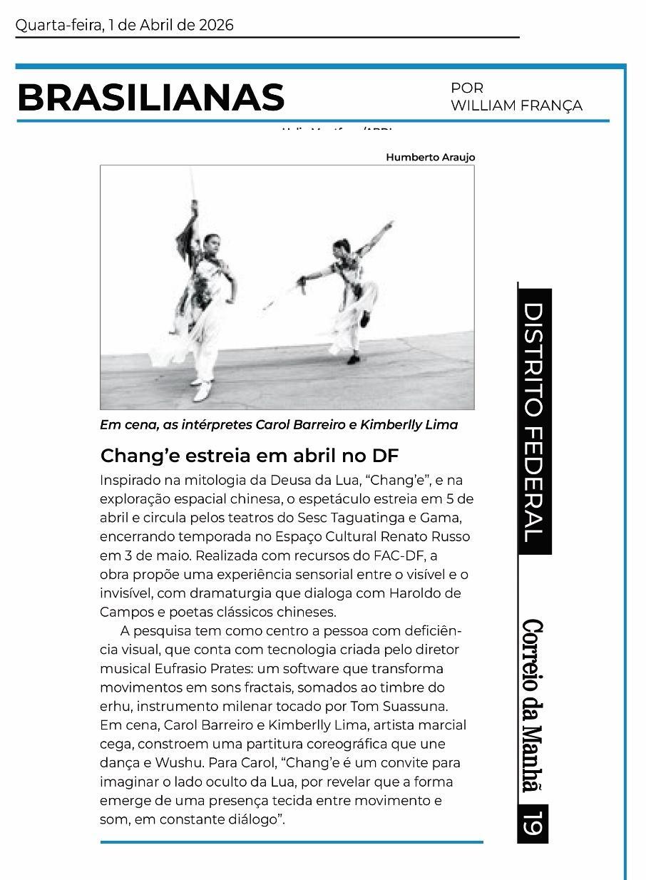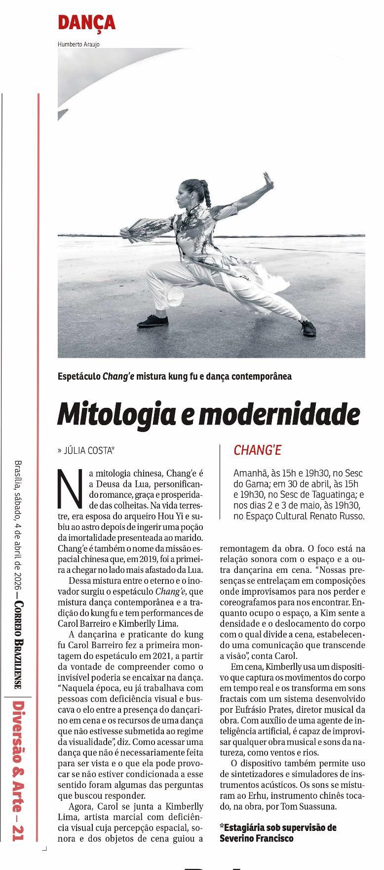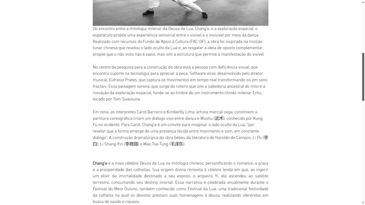 Em cena, as intérpretes Carol Barreiro e Kimberlly Lima, artista marcial cega, constroem a partitura coreográfica criam um diálogo vivo entre dança e Wushu (武术), conhecido por Kung Fu no ocidente Para Carol, Chang’e é um convite para imaginar o lado oculto da Lua, “por revelar que a forma emerge de uma presença tecida entre movimento e som, em constante diálogo” A construção dramatúrgica da obra bebeu da literatura de Haroldo de Campos, Li Po (李白), Li Shang-Yin (李商隱) e Mao Tse-Tung (毛 泽东)
