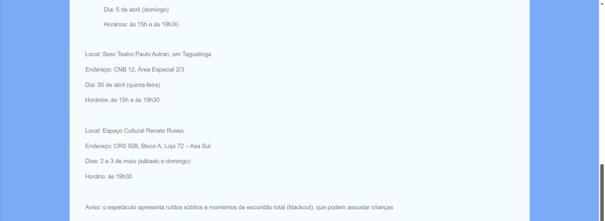 Aviso: o espetáculo apresenta ruídos súbitos e momentos de escuridão total (blackout), que podem assustar crianças