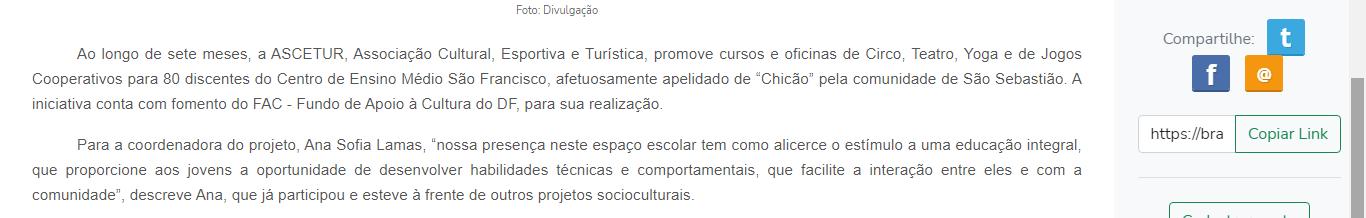 Ao longo de sete meses, a ASCETUR, Associação Cultural, Esportiva e Turística, promove cursos e oficinas de Circo, Teatro, Yoga e de Jogos Cooperativos para 80 discentes do Centro de Ensino Médio São Francisco, afetuosamente apelidado de “Chicão” pela comunidade de São Sebastião. A iniciativa conta com fomento do FAC - Fundo de Apoio à Cultura do DF, para sua realização.