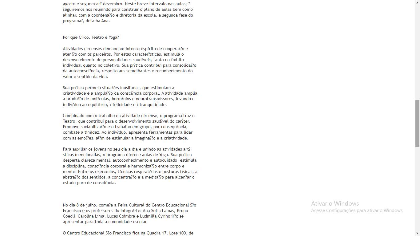 A escolha pelo currículo das disciplinas - teatro, yoga, circo e jogos cooperativos - que foi aplicado mostrou-se eficiente e puderam-se observar alterações significativas no comportamento e aprendizado dos alunos e das alunas. O programa contou com fomento do FAC - Fundo de Apoio à Cultura do Distrito Federal.