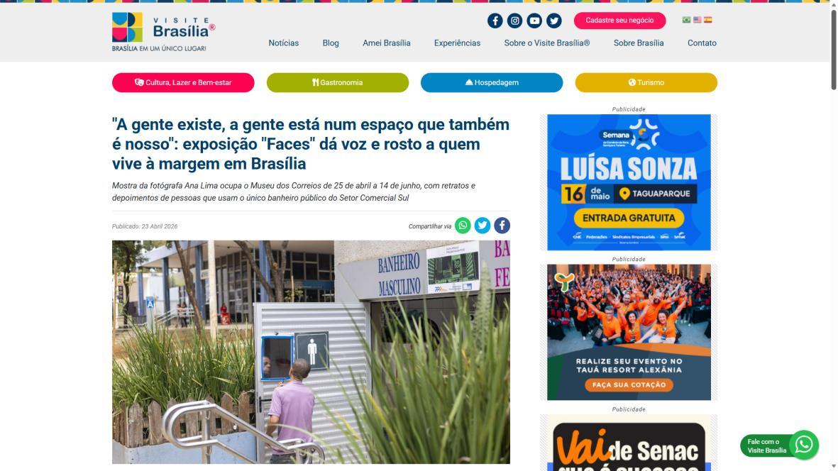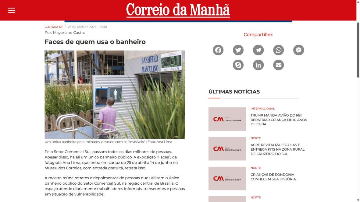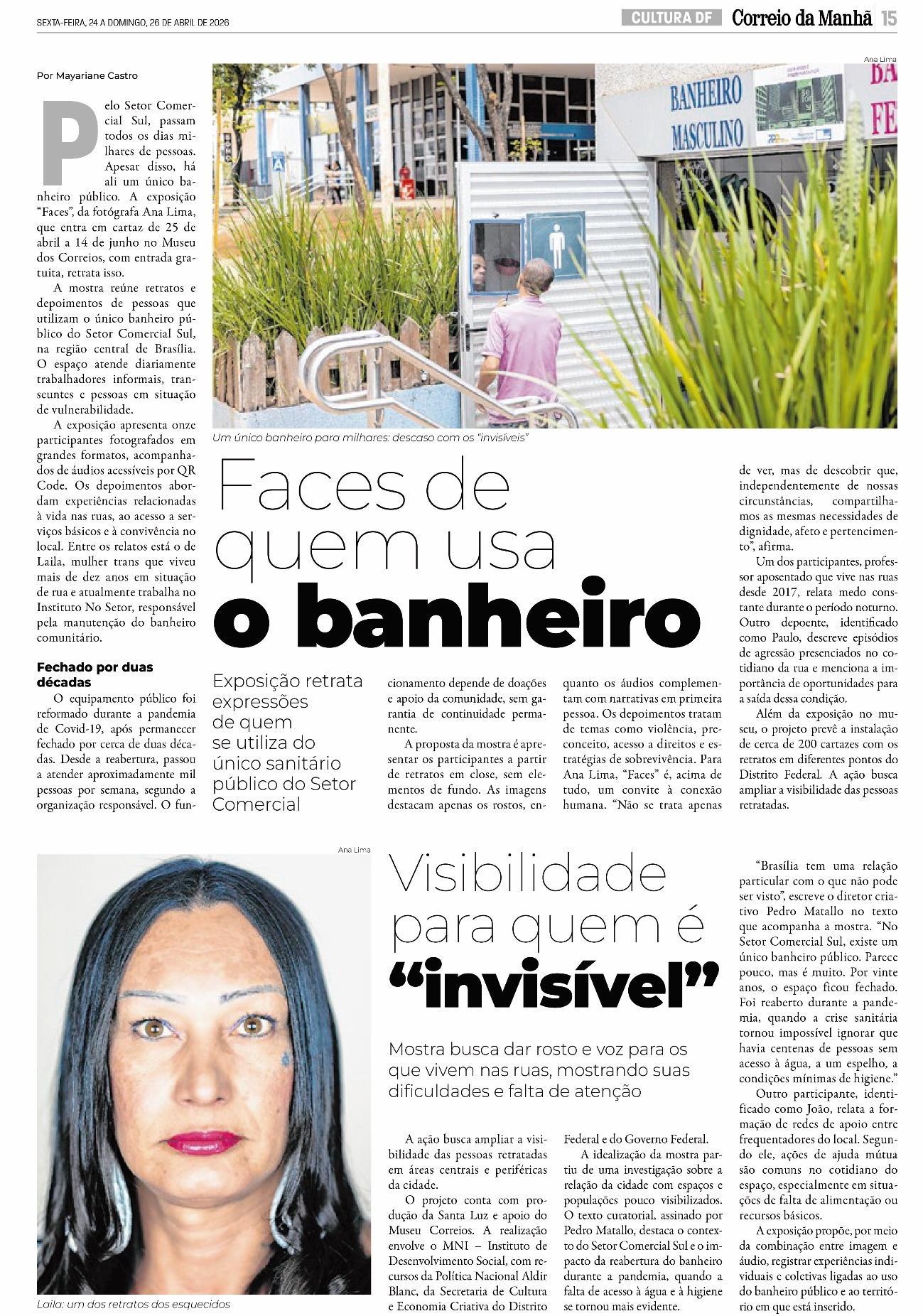 No coração do Setor Comercial Sul, entre os fluxos do comércio, de escritórios e o concreto planejado de Brasília, há um banheiro que se tornou muito mais do que um equipamento público. Reformado durante a pandemia, o espaço é o único do tipo na região e atende diariamente centenas de pessoas em situação de vulnerabilidade, trabalhadores ambulantes, transeuntes moradores e pessoas em situação de rua. É lá que a fotógrafa Ana Lima encontrou os onze protagonistas da exposição “Faces”, que entra em cartaz no Museu dos Correios de 25 de abril a 14 de junho, com entrada gratuita.