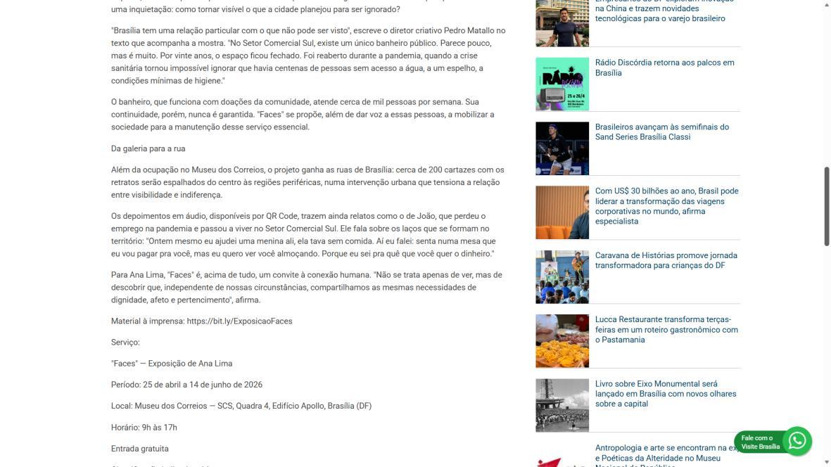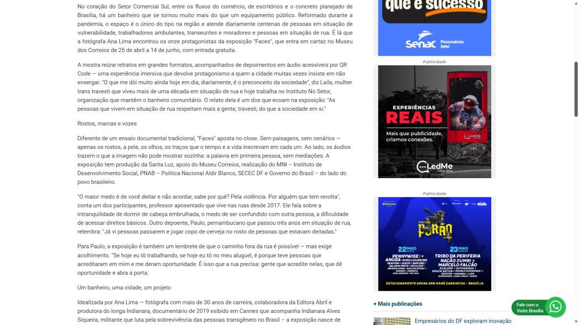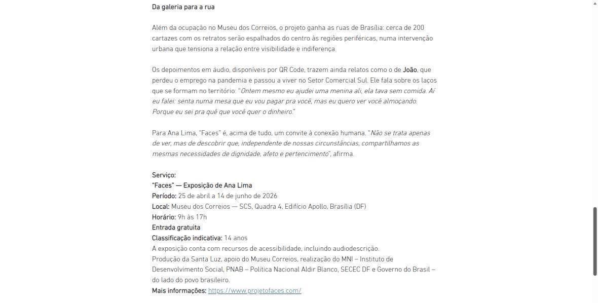 Além da ocupação no Museu dos Correios, o projeto ganha as ruas de Brasília: cerca de 200 cartazes com os retratos serão espalhados do centro às regiões periféricas, numa intervenção urbana que tensiona a relação entre visibilidade e indiferença.