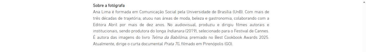 Ana Lima é formada em Comunicação Social pela Universidade de Brasília (UnB). Com mais de três décadas de trajetória, atuou nas áreas de moda, beleza e gastronomia, colaborando com a EditoraAbril por mais de dez anos. No audiovisual, produziu e dirigiu filmes autorais e institucionais, sendo produtora do longa Indianara (2019), selecionado para o Festival de Cannes. É autora das imagens do livro Telma da Babilônia, premiado no Best Cookbook Awards 2025. Atualmente, dirige o curta documental Prata 70, filmado em Pirenópolis (GO).