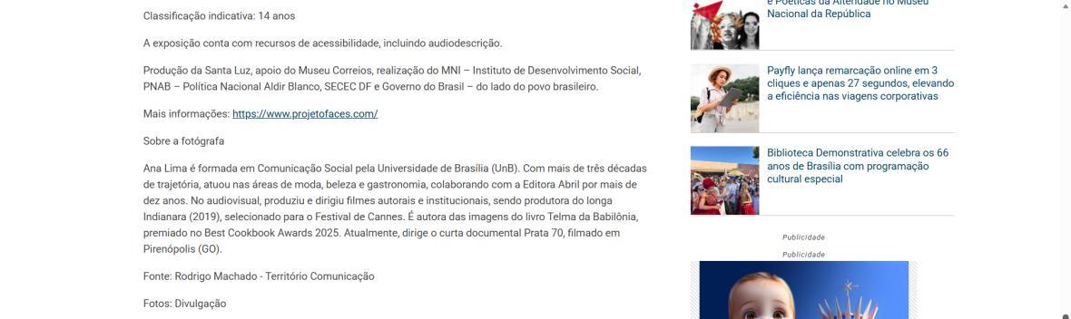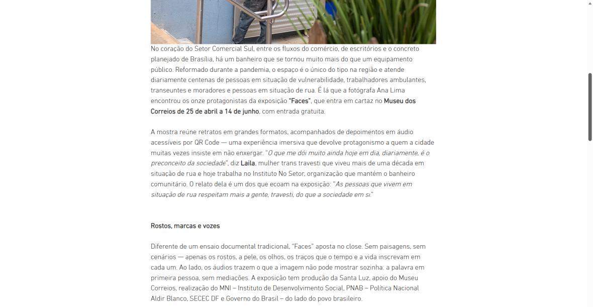 Diferente de um ensaio documental tradicional, “Faces” aposta no close. Sem paisagens, sem cenários apenas os rostos, a pele, os olhos, os traços que o tempo e a vida inscrevam em cada um. Ao lado, os áudios trazem o que a imagem não pode mostrar sozinha: a palavra em primeira pessoa, sem mediações. A exposição tem produção da Santa Luz, apoio do Museu Correios, realização do MNI – Instituto de Desenvolvimento Social, PNAB – Política Nacional Aldir Blanco, SECEC DF e Governo do Brasil – do lado do povo brasileiro.