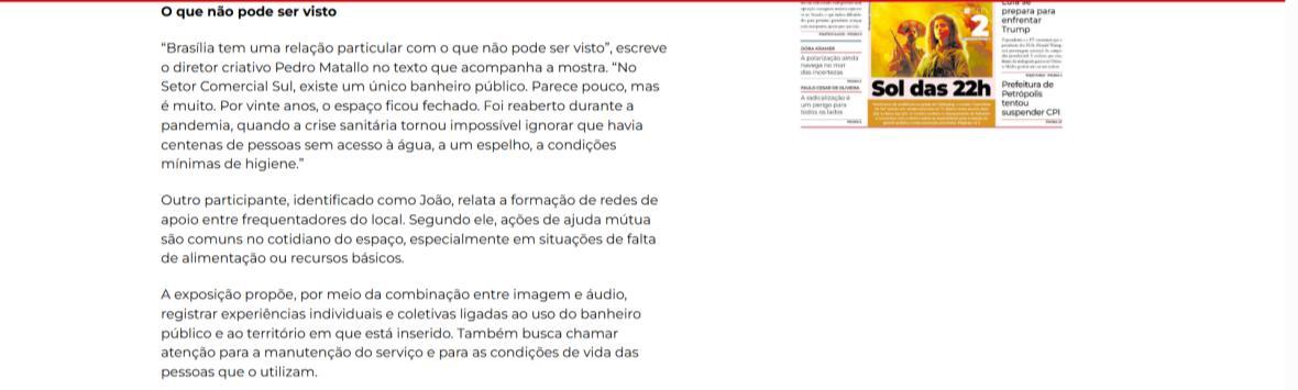 “Brasília tem uma relação particular com o que não pode ser visto”, escreve o diretor criativo Pedro Matallo no texto que acompanha a mostra. “No Setor Comercial Sul, existe um único banheiro público. Parece pouco, mas é muito. Por vinte anos, o espaço ficou fechado. Foi reaberto durante a pandemia, quando a crise sanitária tornou impossível ignorar que havia centenas de pessoas sem acesso a água, a um espelho, a condições mínimas de higiene.”