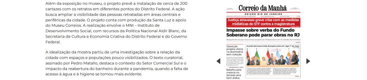 A exposição conta com recursos de acessibilidade, incluindo audiodescrição. Produção da Santa Luz, apoio do Museu Correios, realização do MNI – Instituto de Desenvolvimento Social, PNAB – Política Nacional Aldir Blanco, SECEC DF e Governo do Brasil – do lado do povo brasileiro.