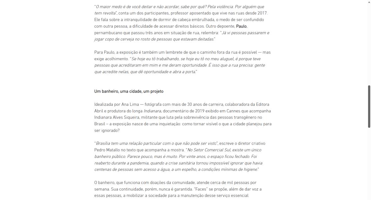 A mostra reúne retratos em grandes formatos, acompanhados de depoimentos em áudio acessíveis por QR Code uma experiência imersiva que devolve protagonismo a quem a cidade muitas vezes insiste em não enxergar. “O que me dói muito ainda hoje em dia, diariamente, é o preconceito da sociedade”, diz Laila, mulher trans travesti que viveu mais de uma década em situação de rua e hoje trabalha no Instituto No Setor, organização que mantém o banheiro comunitário. O relato dela é um dos que ecoam na exposição: “As pessoas que vivem em situação de rua respeitam mais a gente, travesti, do que a sociedade em si.”