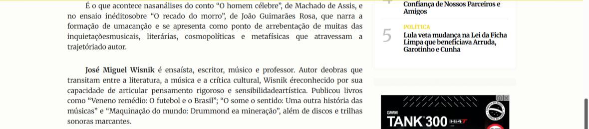 É o que acontece nas análises do conto “O homem célebre”, de Machado de Assis, e no ensaio inédito sobre “O recado do morro”, de João Guimarães Rosa, que narra a formação de uma canção e se apresenta como ponto de arrebentação de muitas das inquietações musicais, literárias, cosmopolíticas e metafísicas que atravessam a trajetória do autor.