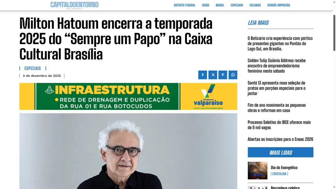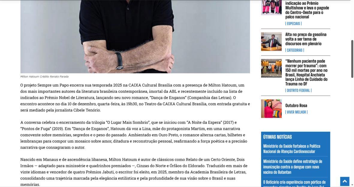 mídia - Correio da manhã - BRASILIANAS | Milton Hatoum encerra a temporada 2025 do 'Sempre um Papo' na Caixa Cultural |Academia Brasileira de Letras