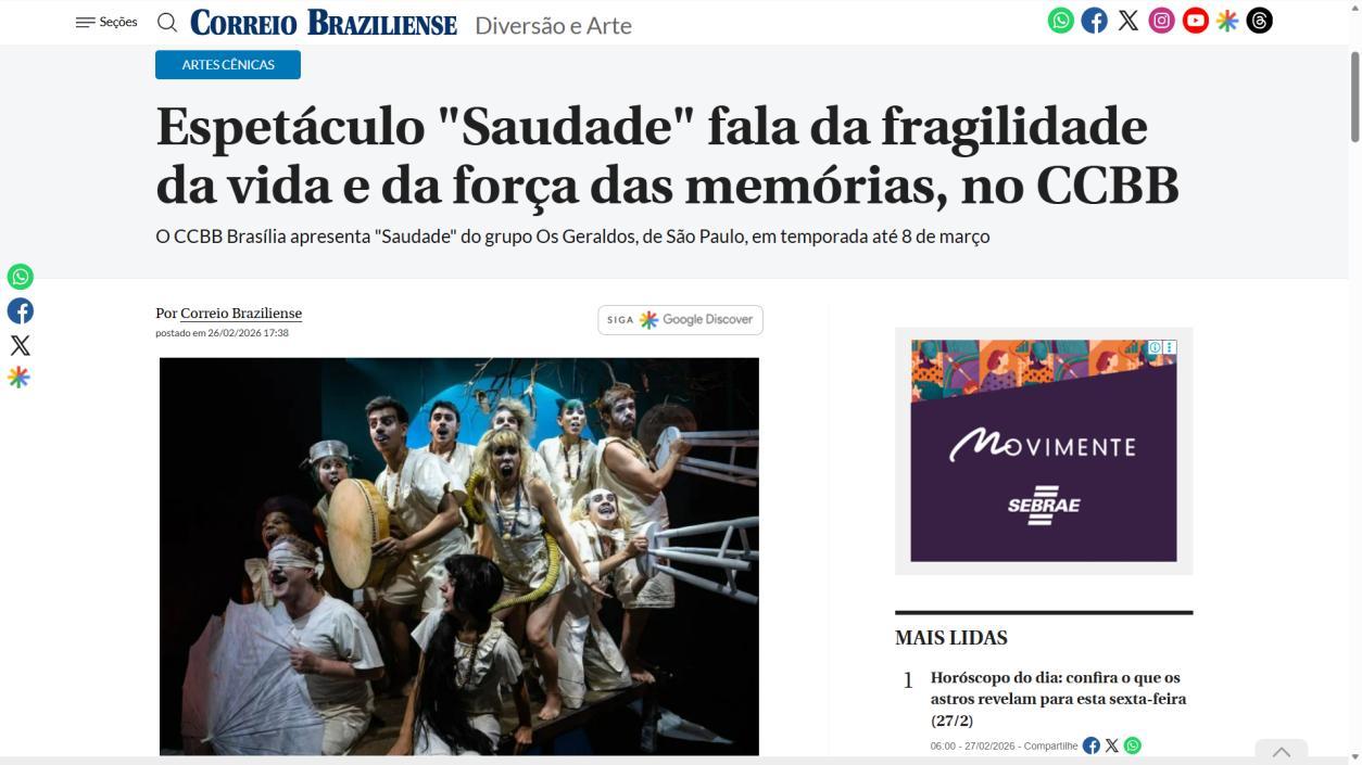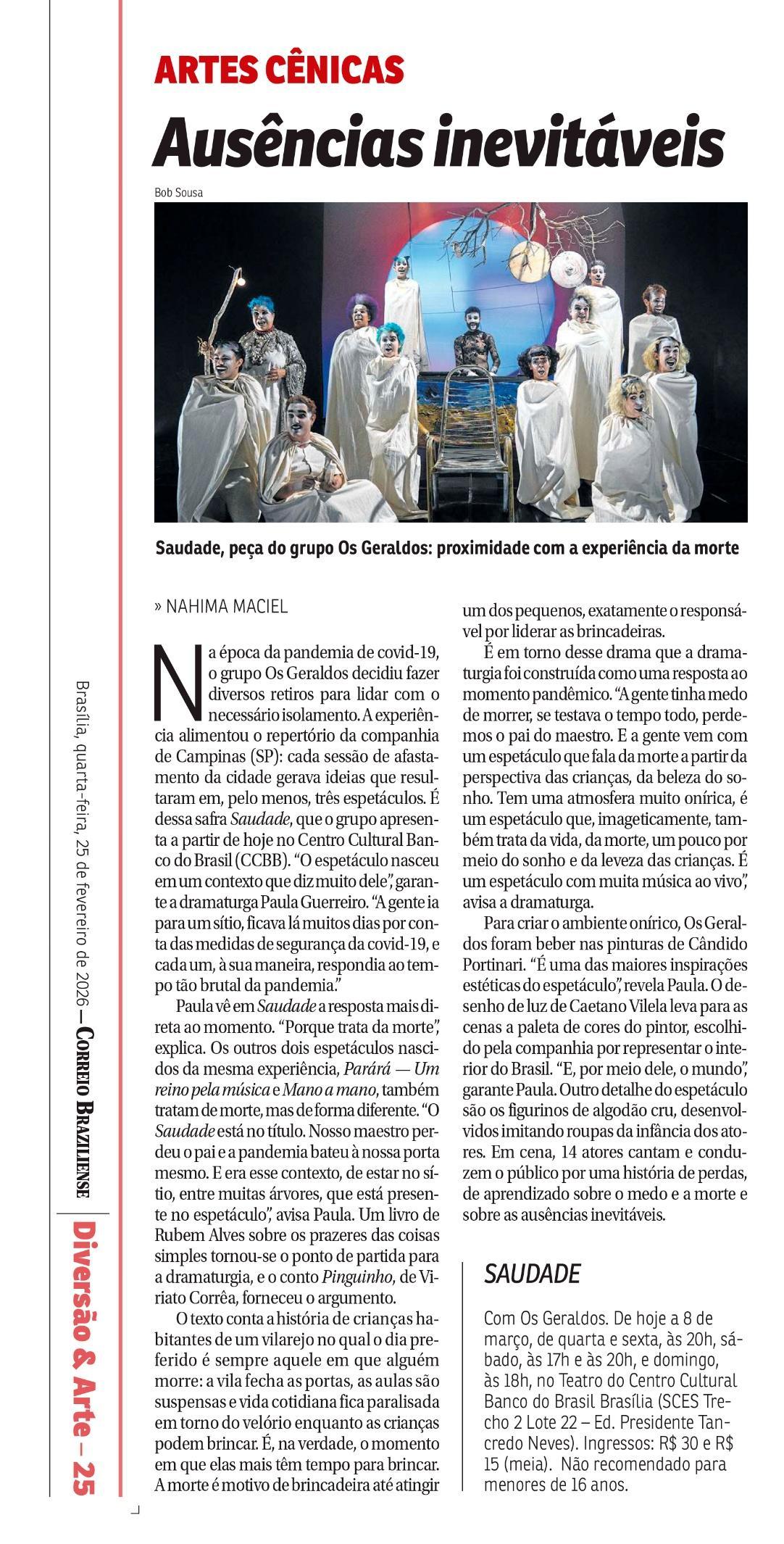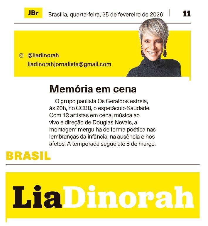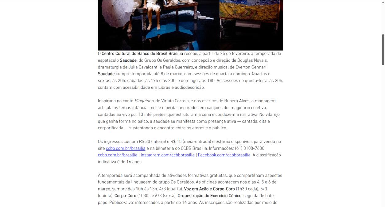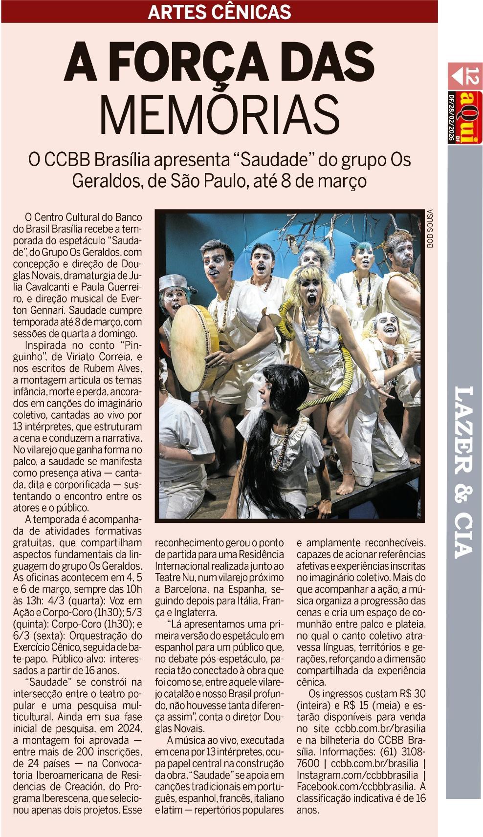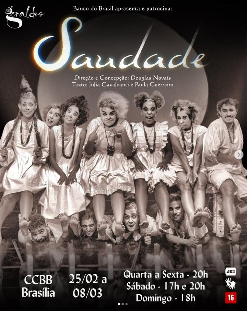 O Centro Cultural do Banco do Brasil Brasília recebe, a partir de 25 de fevereiro, a temporada do espetáculo Saudade, do Grupo Os Geraldos, com concepção e direção de Douglas Novais, dramaturgia de Julia Cavalcanti e Paula Guerreiro, e direção musical de Everton Gennari Saudade cumpre temporada até 8 de março, com sessões de quarta a domingo. Quartas e sextas, às 20h; sábados, às 17h e às 20h; e domingos, às 18h. As sessões de quinta-feira, às 20h, contam com acessibilidade em Libras e audiodescrição.