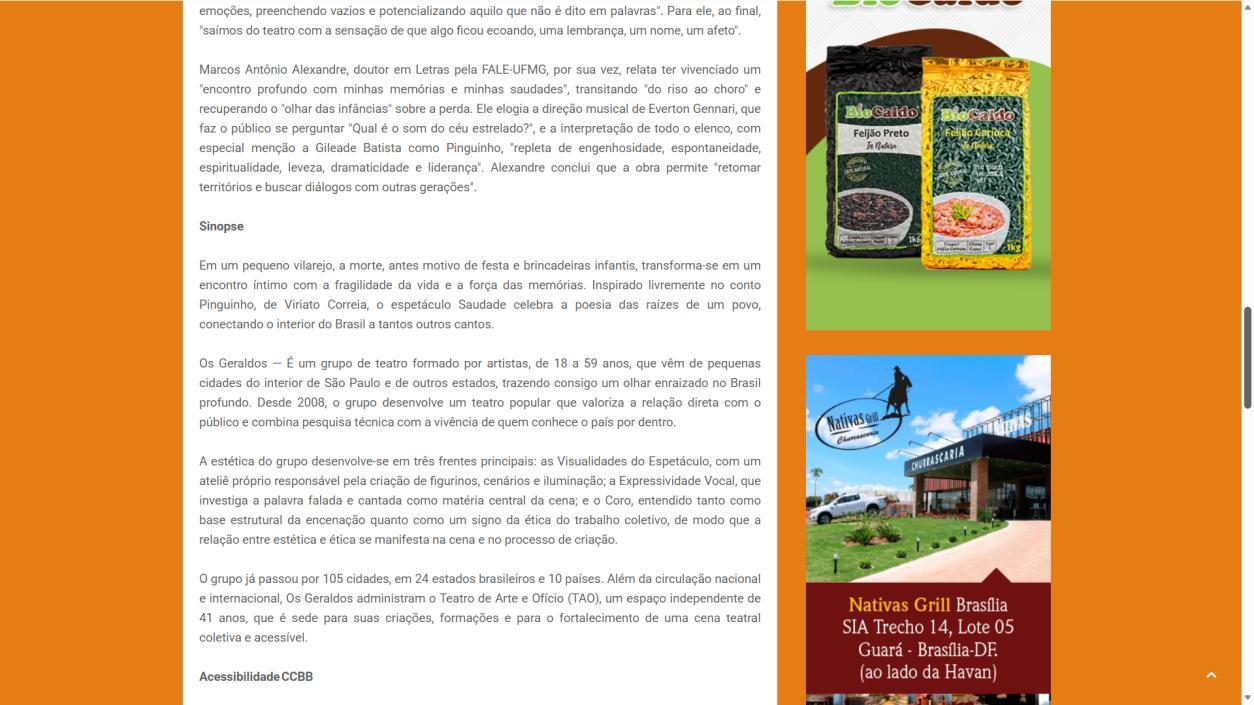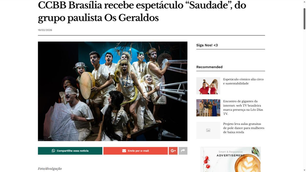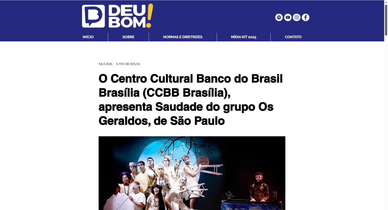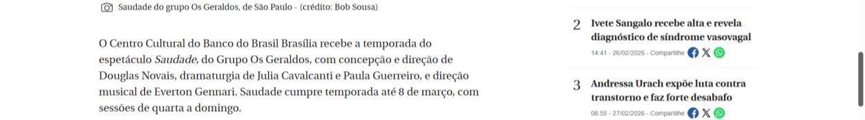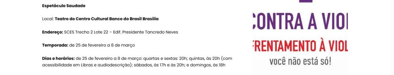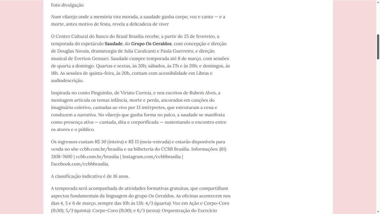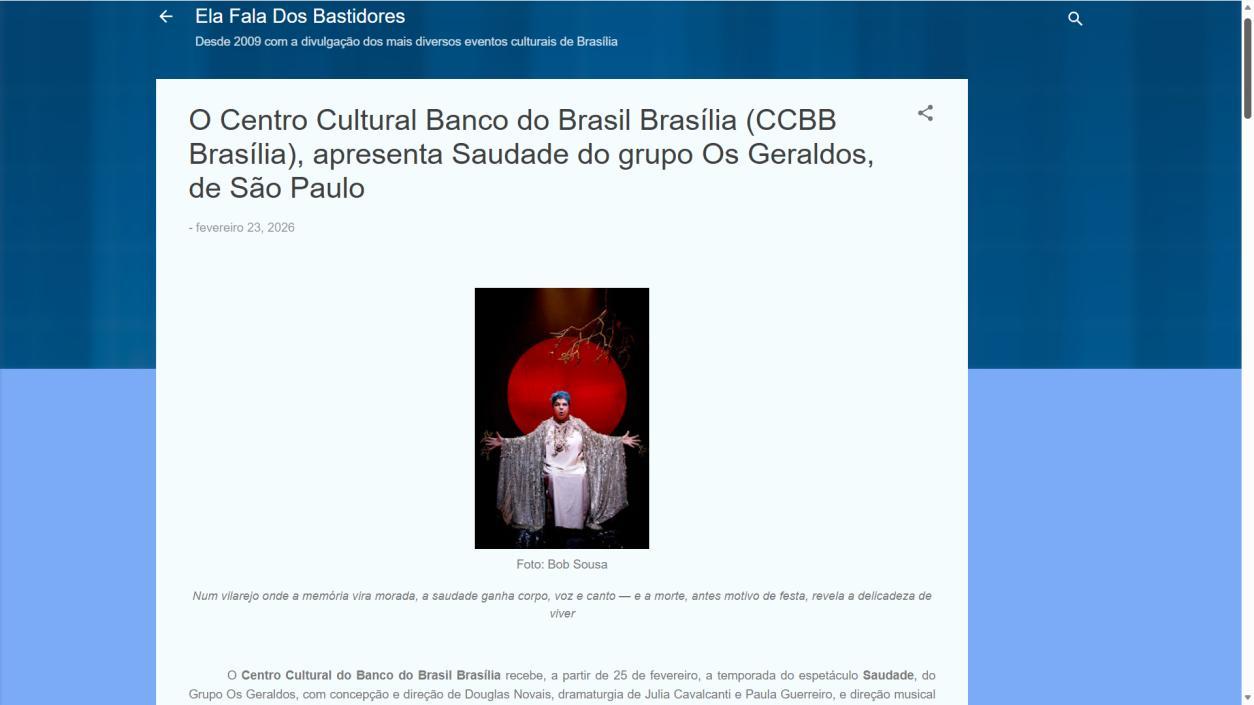 O Centro Cultural do Banco do Brasil Brasília recebe, a partir de 25 de fevereiro, a temporada do espetáculo Saudade, do Grupo Os Geraldos, com concepção e direção de Douglas Novais, dramaturgia de Julia Cavalcanti e Paula Guerreiro, e direção musical de Everton Gennari Saudade cumpre temporada até 8 de março, com sessões de quarta a domingo. Quartas e sextas, às 20h; sábados, às 17h e às 20h; e domingos, às 18h. As sessões de quinta-feira, às 20h, contam com acessibilidade em Libras e audiodescrição.