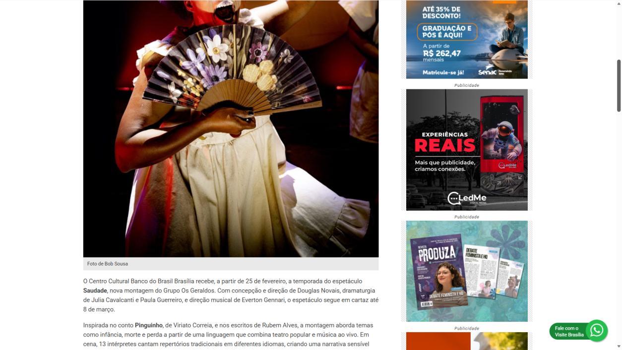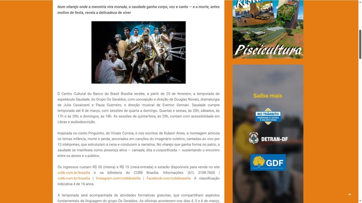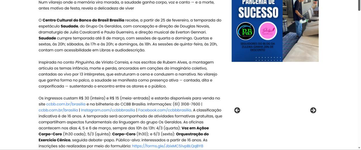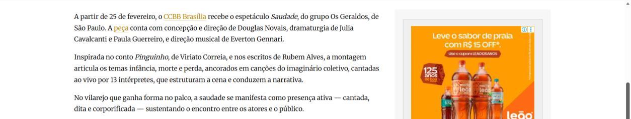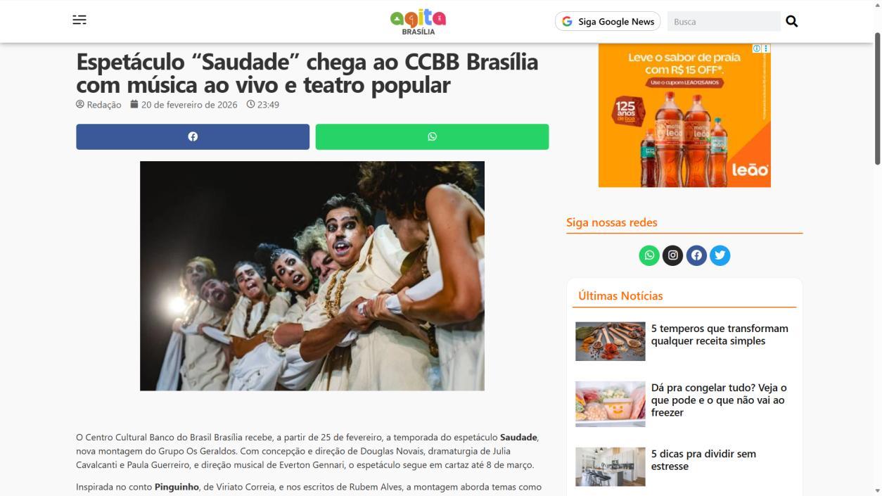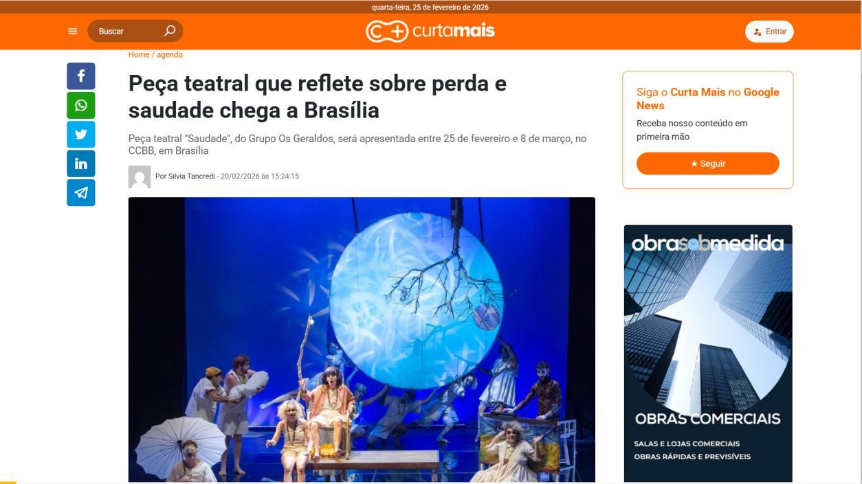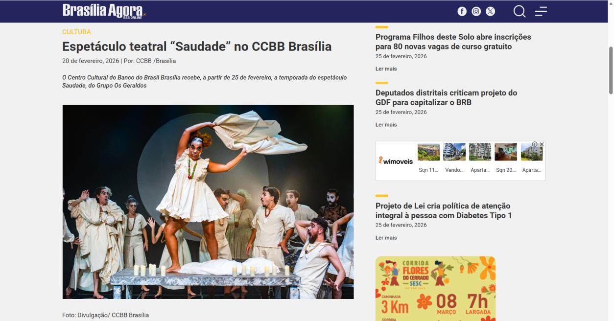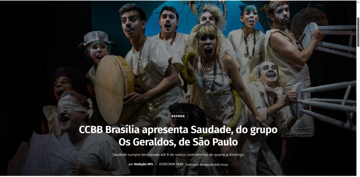 A temporada do espetáculo Saudade no Centro Cultural Banco do Brasil Brasília chega à sua reta final, e ainda dá tempo de mergulhar nessa experiência cênica que vem tocando plateias desde a estreia. Com apresentações até o dia 8 de março, a montagem do Grupo Os Geraldos transforma o teatro em um espaço de memória e afeto, onde a saudade ganha corpo, voz e canto. O público, que já assistiu, sai emocionado e leva consigo ecos das canções e das imagens de um vilarejo inventado, mas tão familiar que parece morar dentro de cada um.