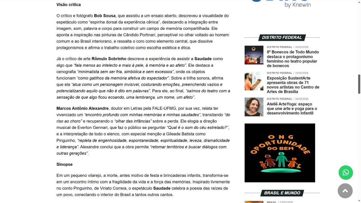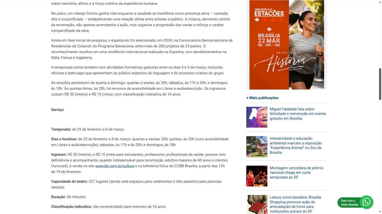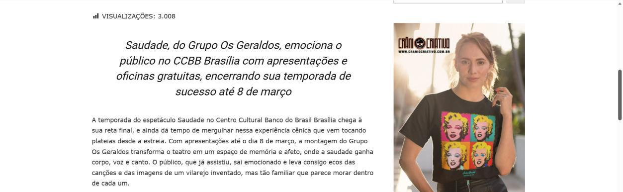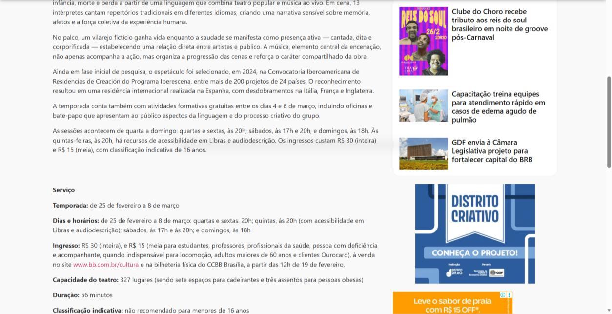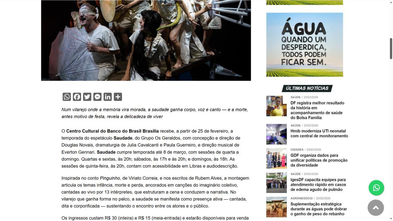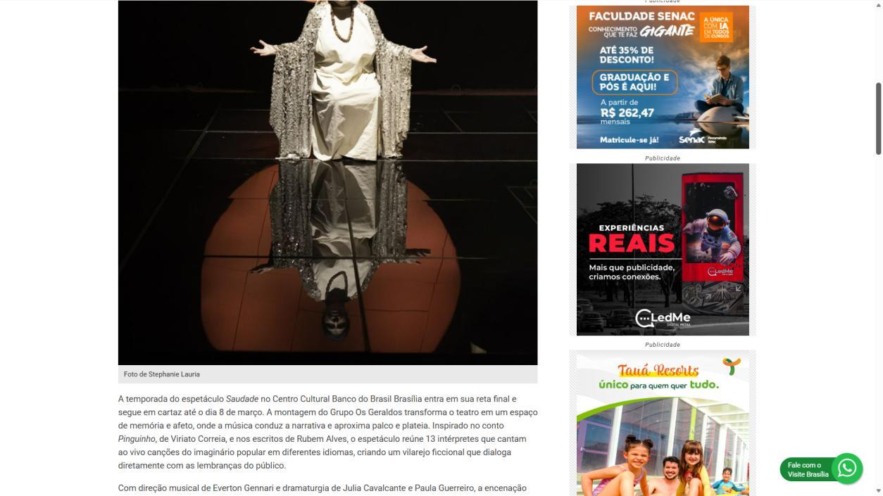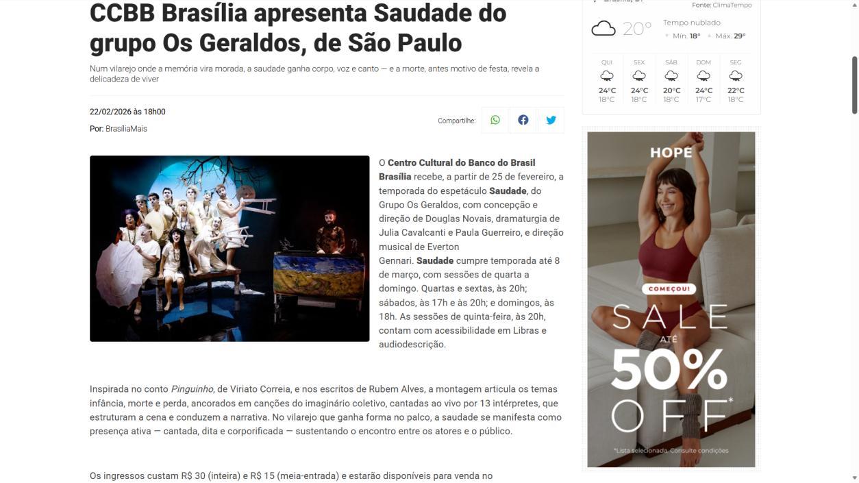 A temporada do espetáculo Saudade no Centro Cultural Banco do Brasil Brasília chega à sua reta final, e ainda dá tempo de mergulhar nessa experiência cênica que vem tocando plateias desde a estreia. Com apresentações até o dia 8 de março, a montagem do Grupo Os Geraldos transforma o teatro em um espaço de memória e afeto, onde a saudade ganha corpo, voz e canto. O público, que já assistiu, sai emocionado e leva consigo ecos das canções e das imagens de um vilarejo inventado, mas tão familiar que parece morar dentro de cada um.