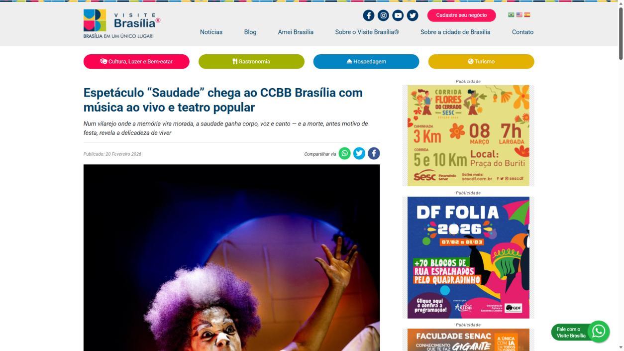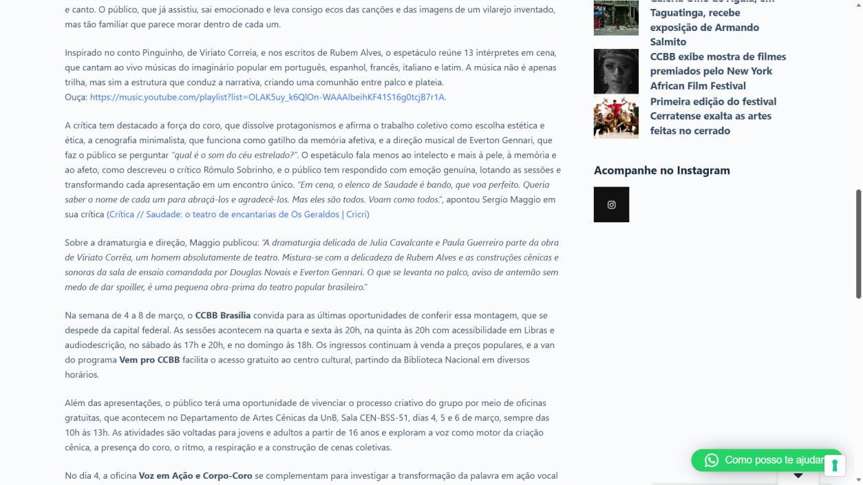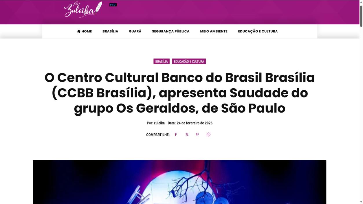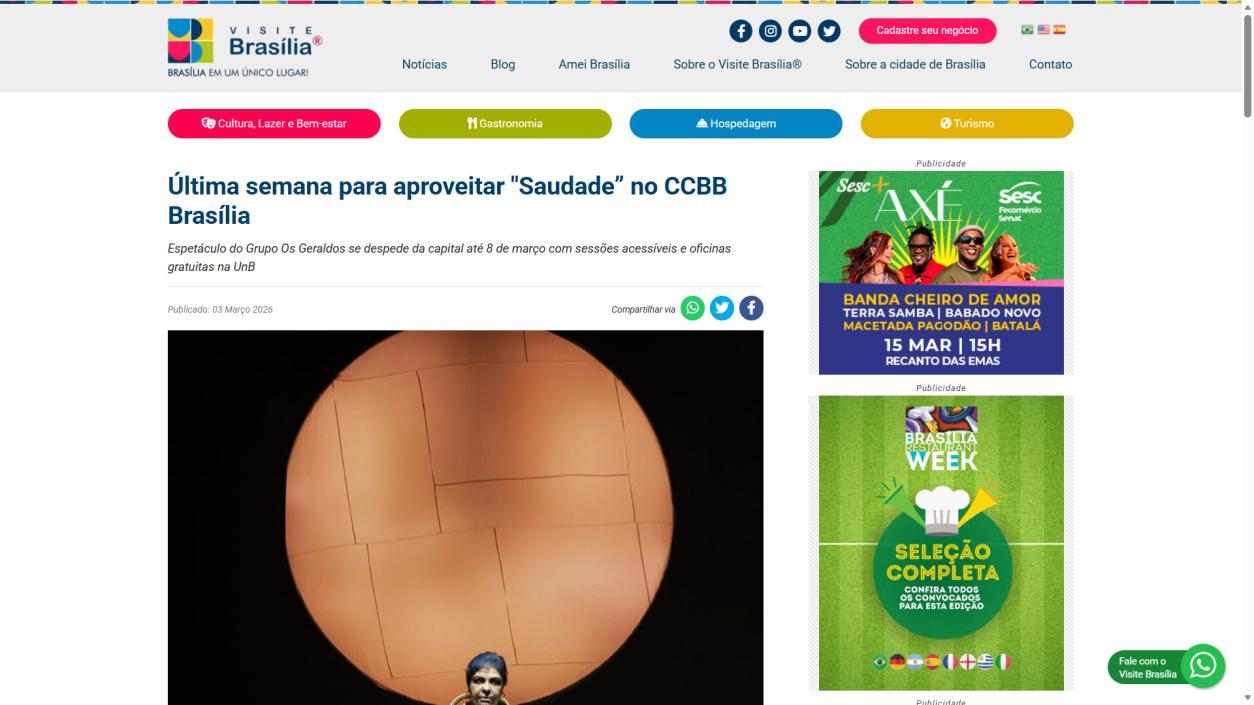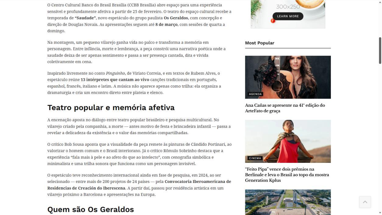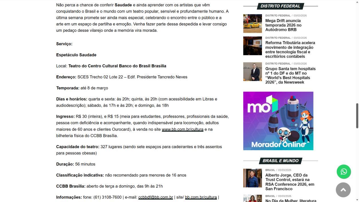 A temporada do espetáculo Saudade no Centro Cultural Banco do Brasil Brasília chega à sua reta final, e ainda dá tempo de mergulhar nessa experiência cênica que vem tocando plateias desde a estreia. Com apresentações até o dia 8 de março, a montagem do Grupo Os Geraldos transforma o teatro em um espaço de memória e afeto, onde a saudade ganha corpo, voz e canto. O público, que já assistiu, sai emocionado e leva consigo ecos das canções e das imagens de um vilarejo inventado, mas tão familiar que parece morar dentro de cada um.