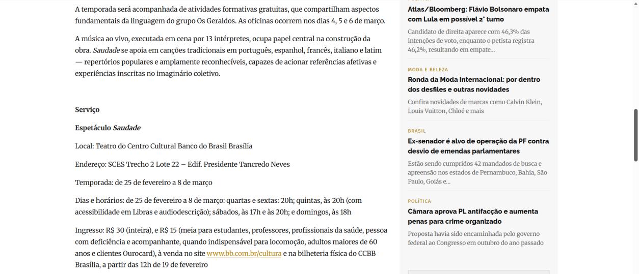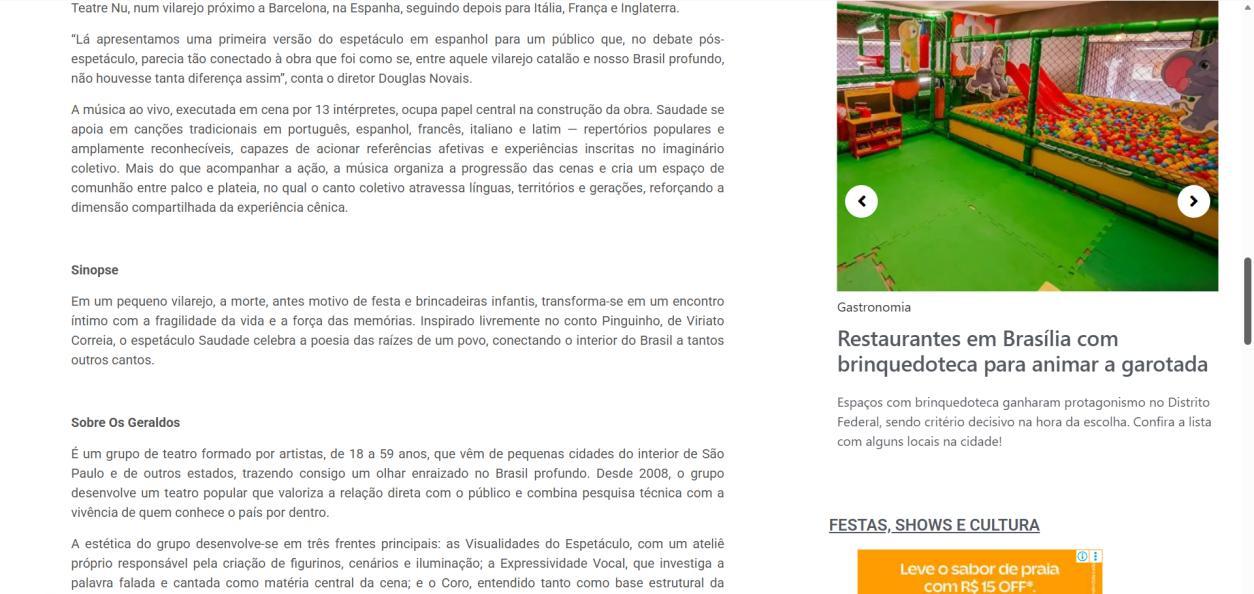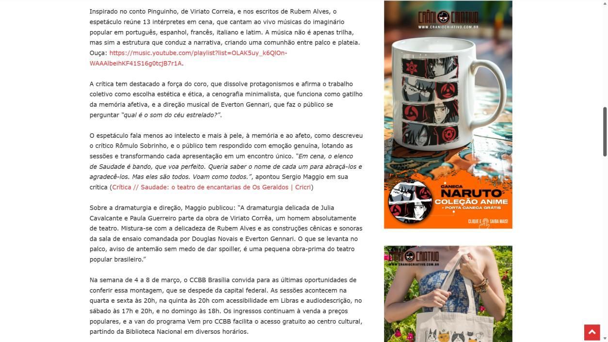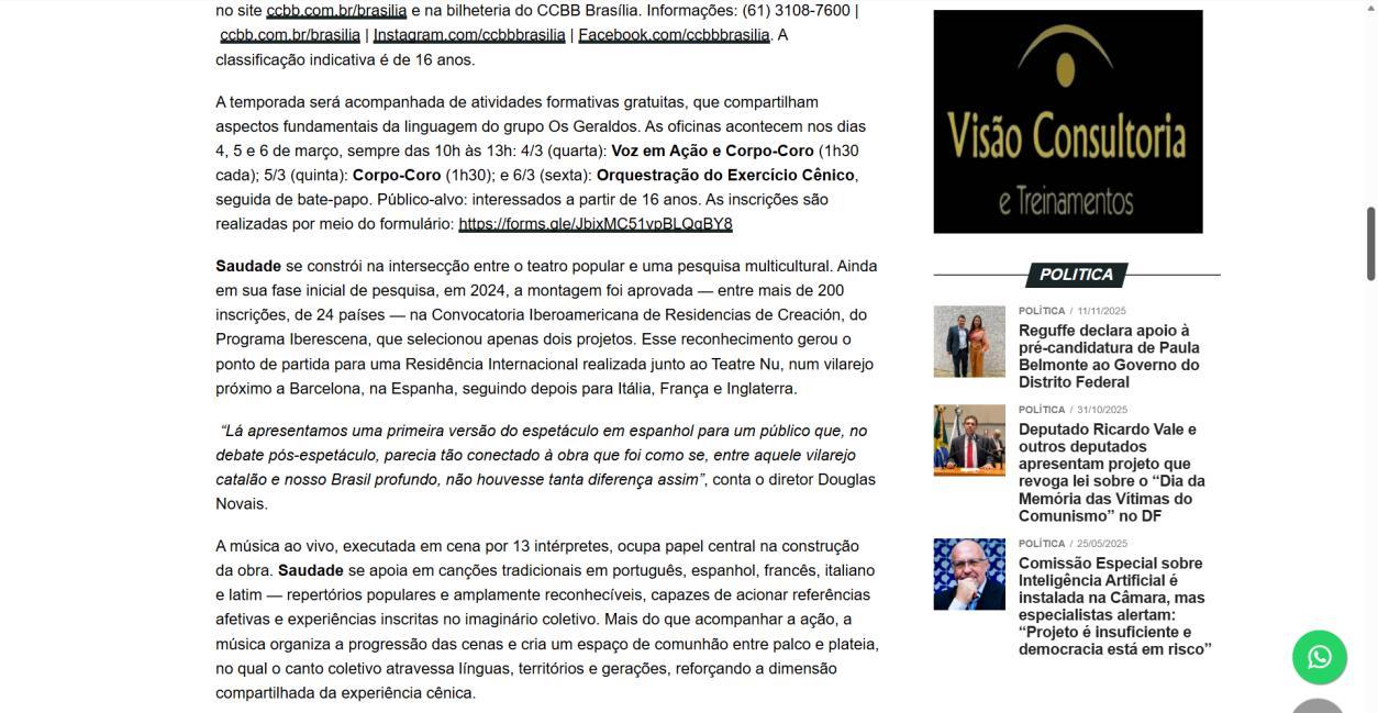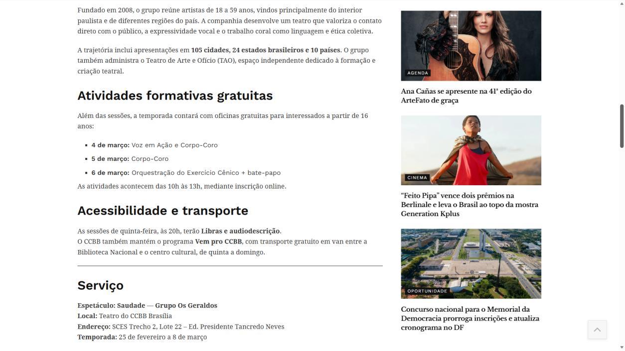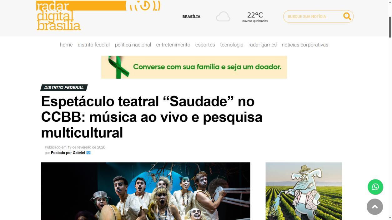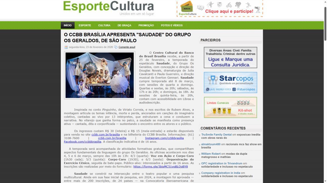 A temporada do espetáculo Saudade no Centro Cultural Banco do Brasil Brasília chega à sua reta final, e ainda dá tempo de mergulhar nessa experiência cênica que vem tocando plateias desde a estreia. Com apresentações até o dia 8 de março, a montagem do Grupo Os Geraldos transforma o teatro em um espaço de memória e afeto, onde a saudade ganha corpo, voz e canto. O público, que já assistiu, sai emocionado e leva consigo ecos das canções e das imagens de um vilarejo inventado, mas tão familiar que parece morar dentro de cada um.