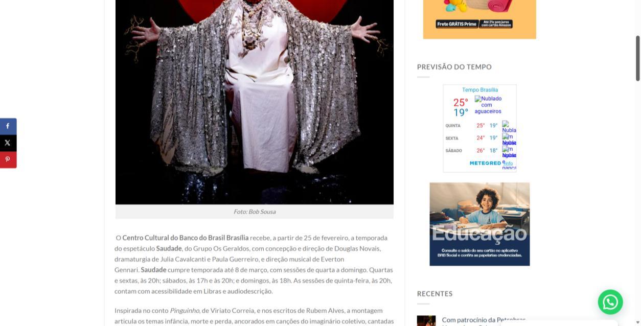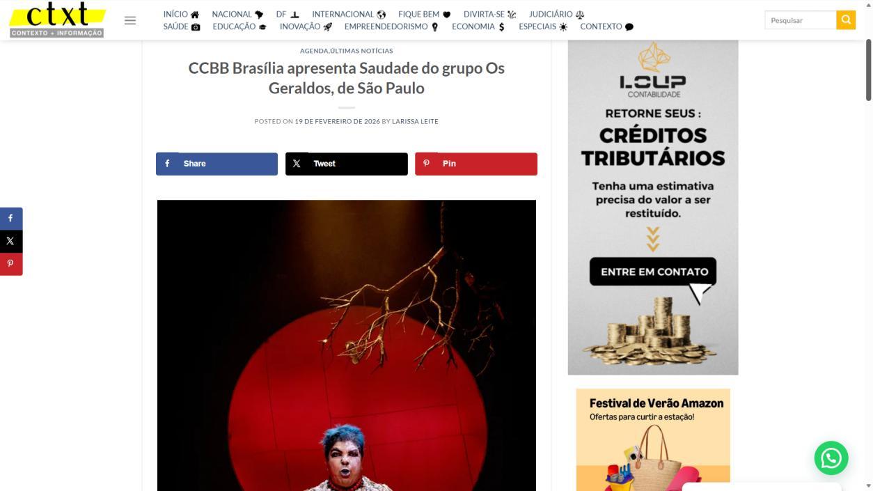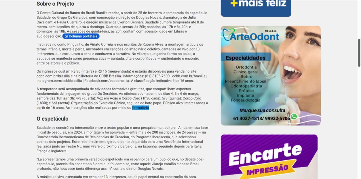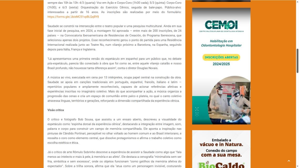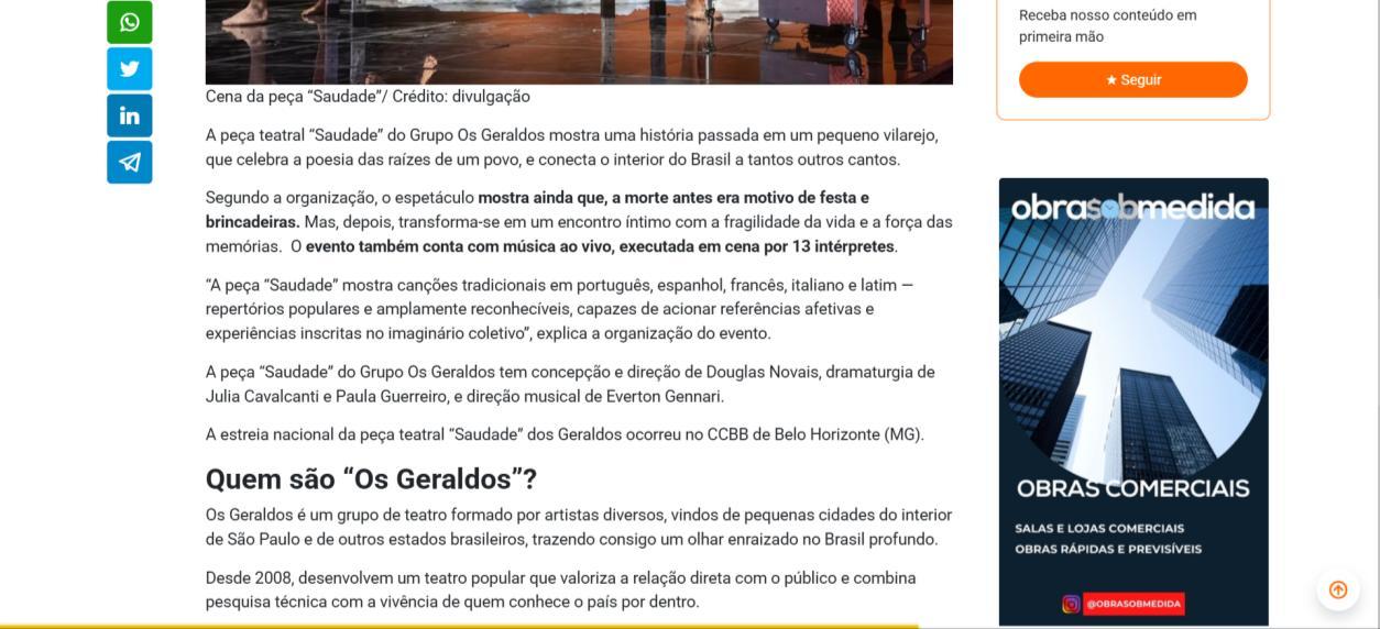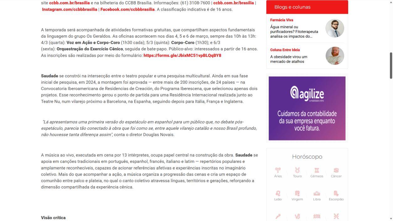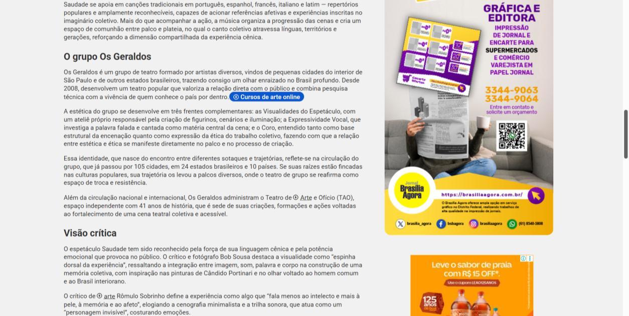 A temporada do espetáculo Saudade no Centro Cultural Banco do Brasil Brasília chega à sua reta final, e ainda dá tempo de mergulhar nessa experiência cênica que vem tocando plateias desde a estreia. Com apresentações até o dia 8 de março, a montagem do Grupo Os Geraldos transforma o teatro em um espaço de memória e afeto, onde a saudade ganha corpo, voz e canto. O público, que já assistiu, sai emocionado e leva consigo ecos das canções e das imagens de um vilarejo inventado, mas tão familiar que parece morar dentro de cada um.