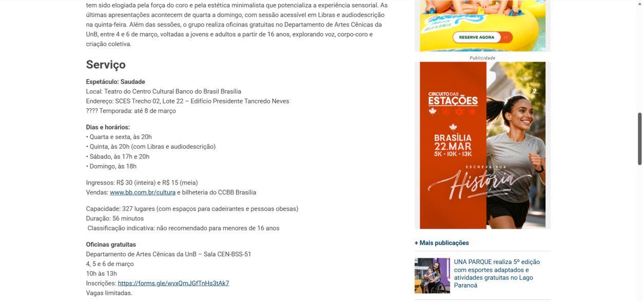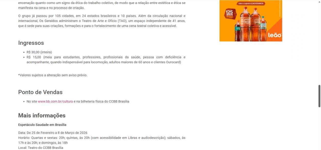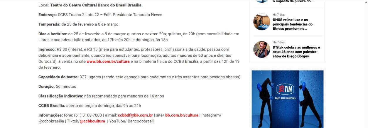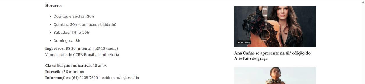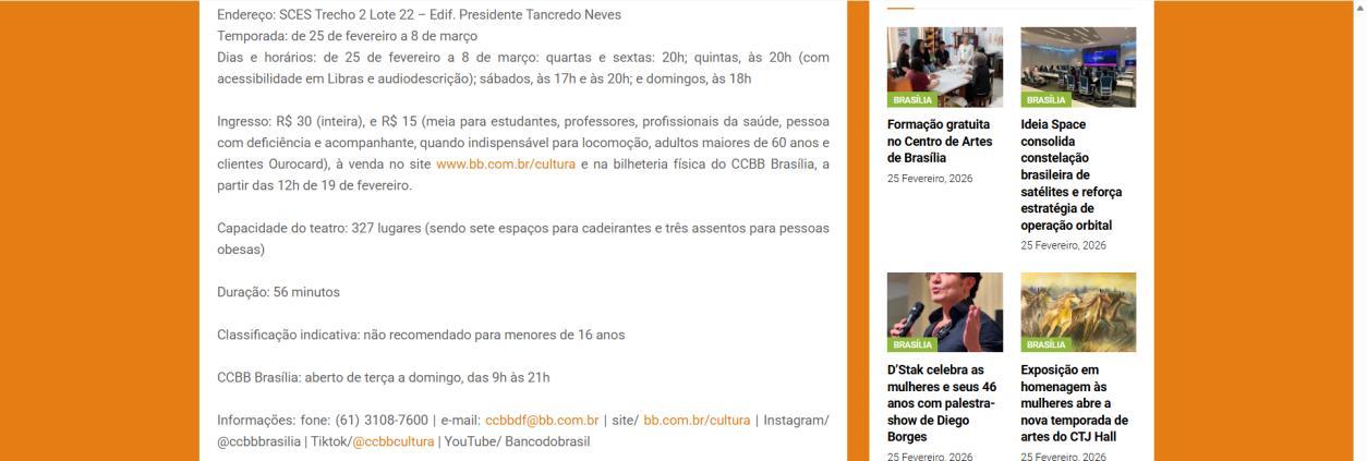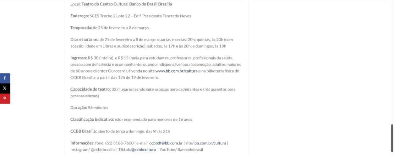 Na semana de 4 a 8 de março, o CCBB Brasília convida para as últimas oportunidades de conferir essa montagem, que se despede da capital federal. As sessões acontecem na quarta e sexta às 20h, na quinta às 20h com acessibilidade em Libras e audiodescrição, no sábado às 17h e 20h, e no domingo às 18h. Os ingressos continuam à venda a preços populares, e a van do programa Vem pro CCBB facilita o acesso gratuito ao centro cultural, partindo da Biblioteca Nacional em diversos horários.