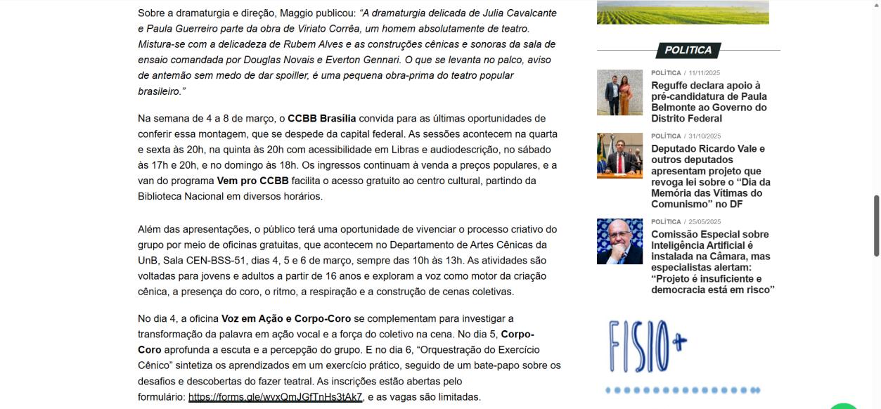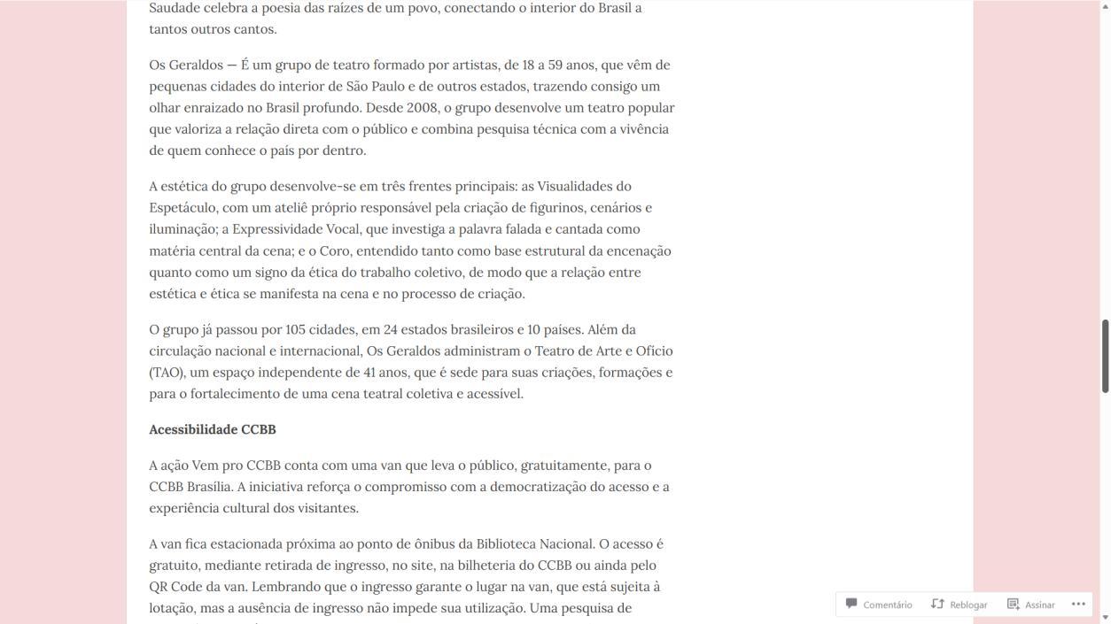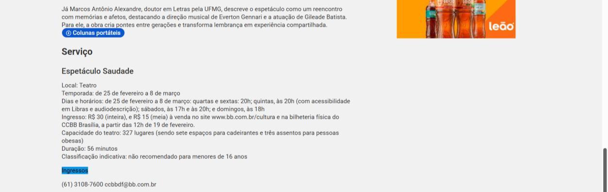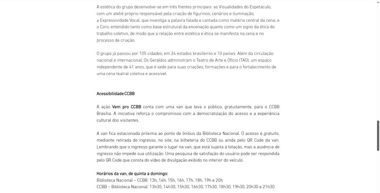 Na semana de 4 a 8 de março, o CCBB Brasília convida para as últimas oportunidades de conferir essa montagem, que se despede da capital federal. As sessões acontecem na quarta e sexta às 20h, na quinta às 20h com acessibilidade em Libras e audiodescrição, no sábado às 17h e 20h, e no domingo às 18h. Os ingressos continuam à venda a preços populares, e a van do programa Vem pro CCBB facilita o acesso gratuito ao centro cultural, partindo da Biblioteca Nacional em diversos horários.
