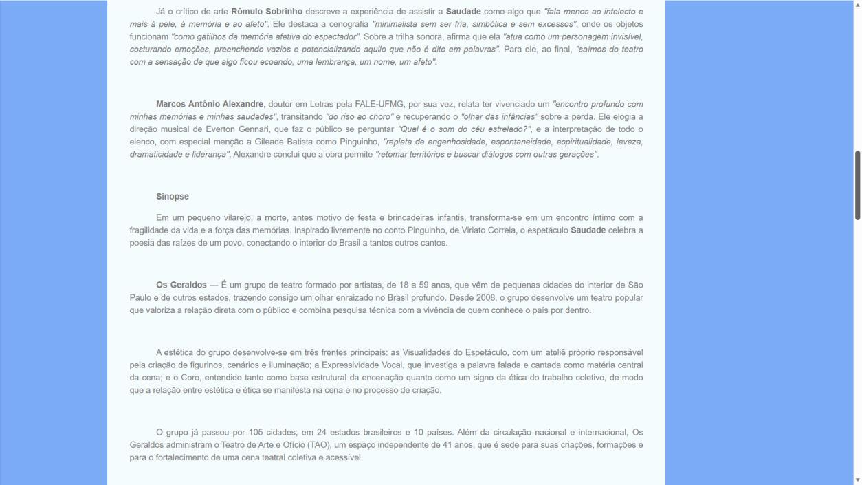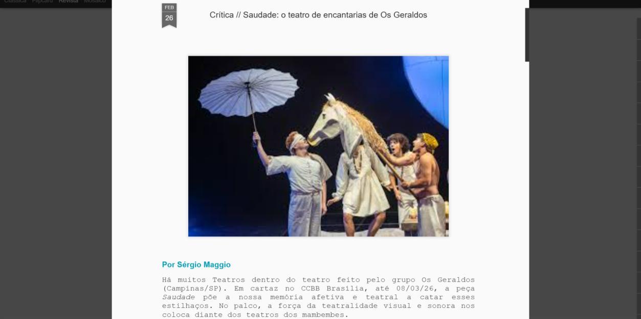 saber o nome de cada um para abraçá-los e agradecê-los. Mas eles são todos. Voam como todos.”, apontou Sergio Maggio em sua crítica (Crítica // Saudade: o teatro de encantarias de Os Geraldos | Cricri)