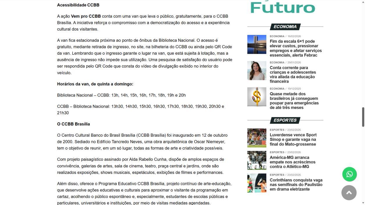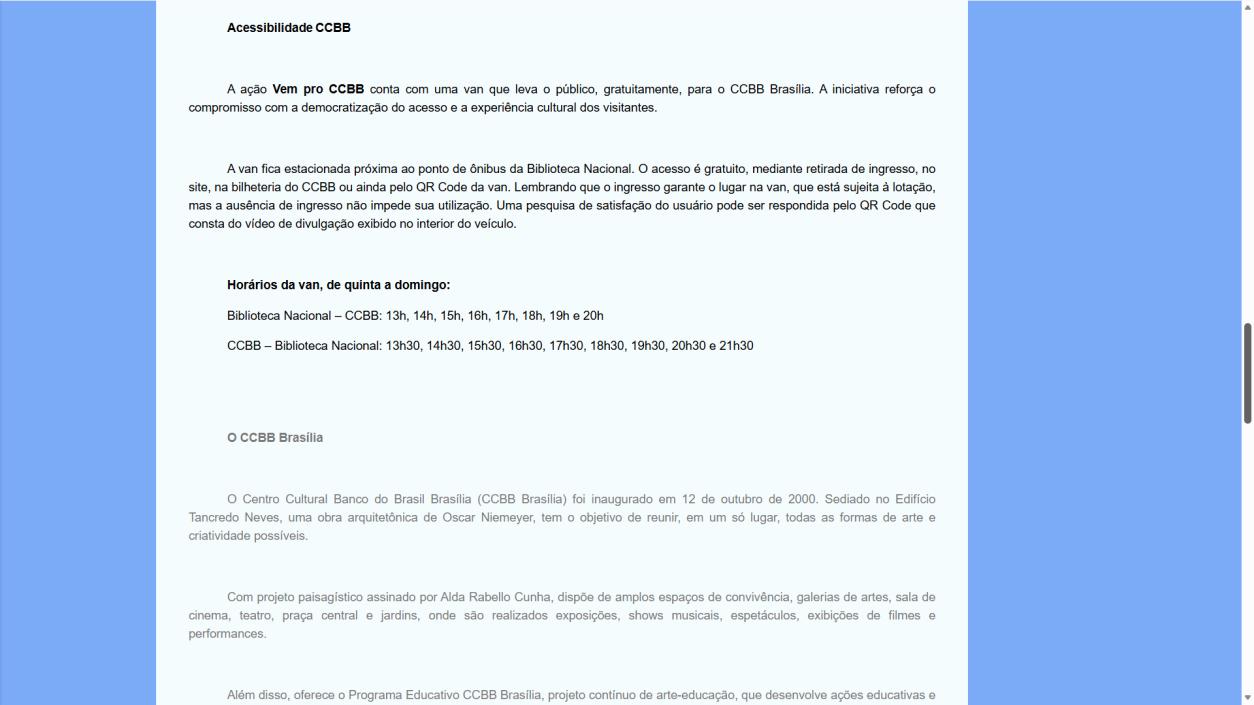 A ação Vem pro CCBB conta com uma van que leva o público, gratuitamente, para o CCBB Brasília. A iniciativa reforça o compromisso com a democratização do acesso e a experiência cultural dos visitantes.