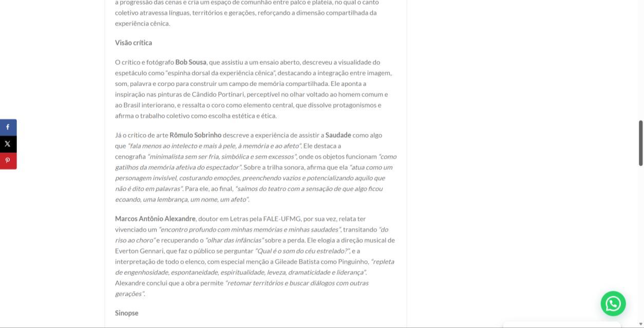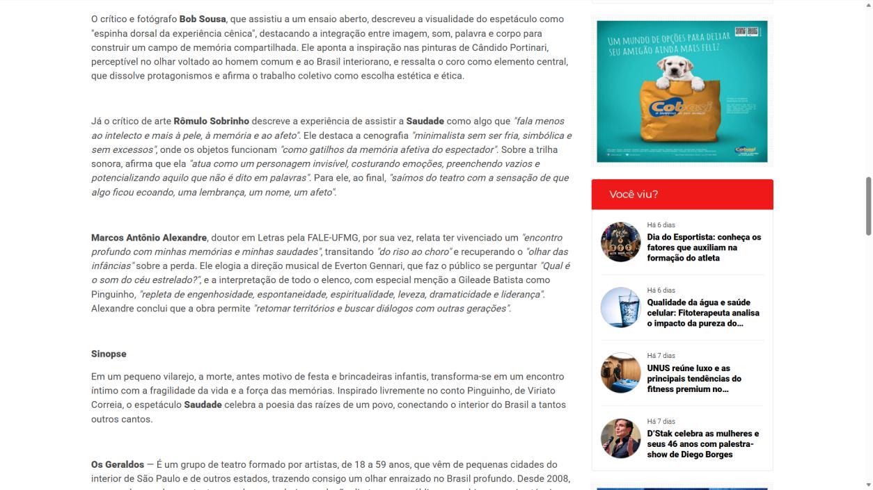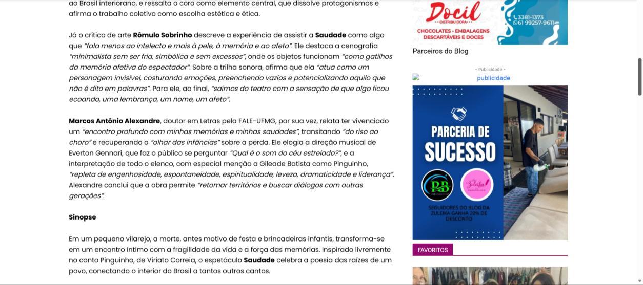 Já o crítico de arte Rômulo Sobrinho descreve a experiência de assistir a Saudade como algo que "fala menos ao intelecto e mais à pele, à memória e ao afeto". Ele destaca a cenografia "minimalista sem ser fria, simbólica e sem excessos", onde os objetos funcionam "como gatilhos da memória afetiva do espectador". Sobre a trilha sonora, afirma que ela "atua como um personagem invisível, costurando emoções, preenchendo vazios e potencializando aquilo que não é dito em palavras". Para ele, ao final, "saímos do teatro com a sensação de que algo ficou ecoando, uma lembrança, um nome, um afeto"