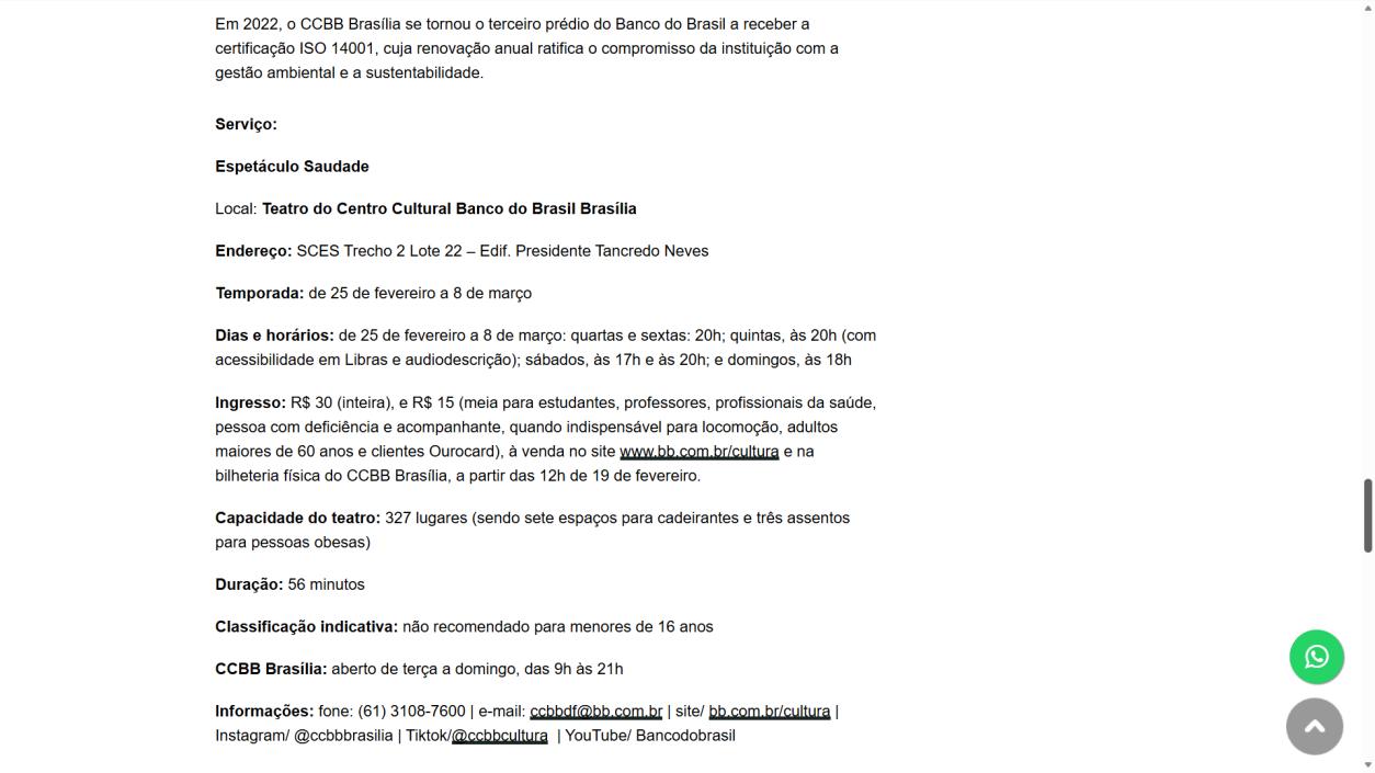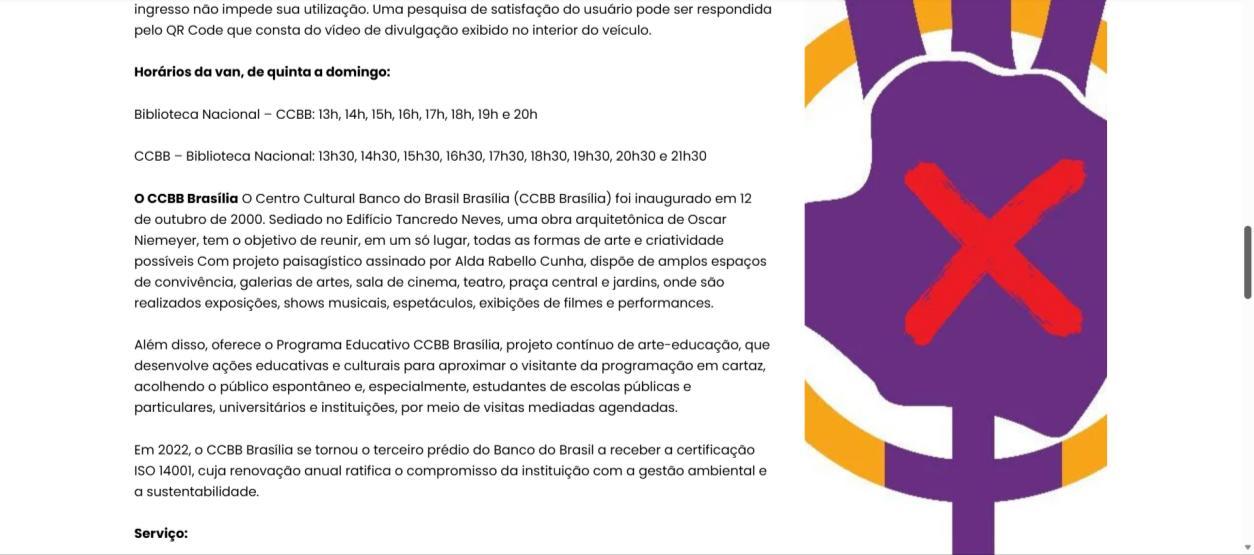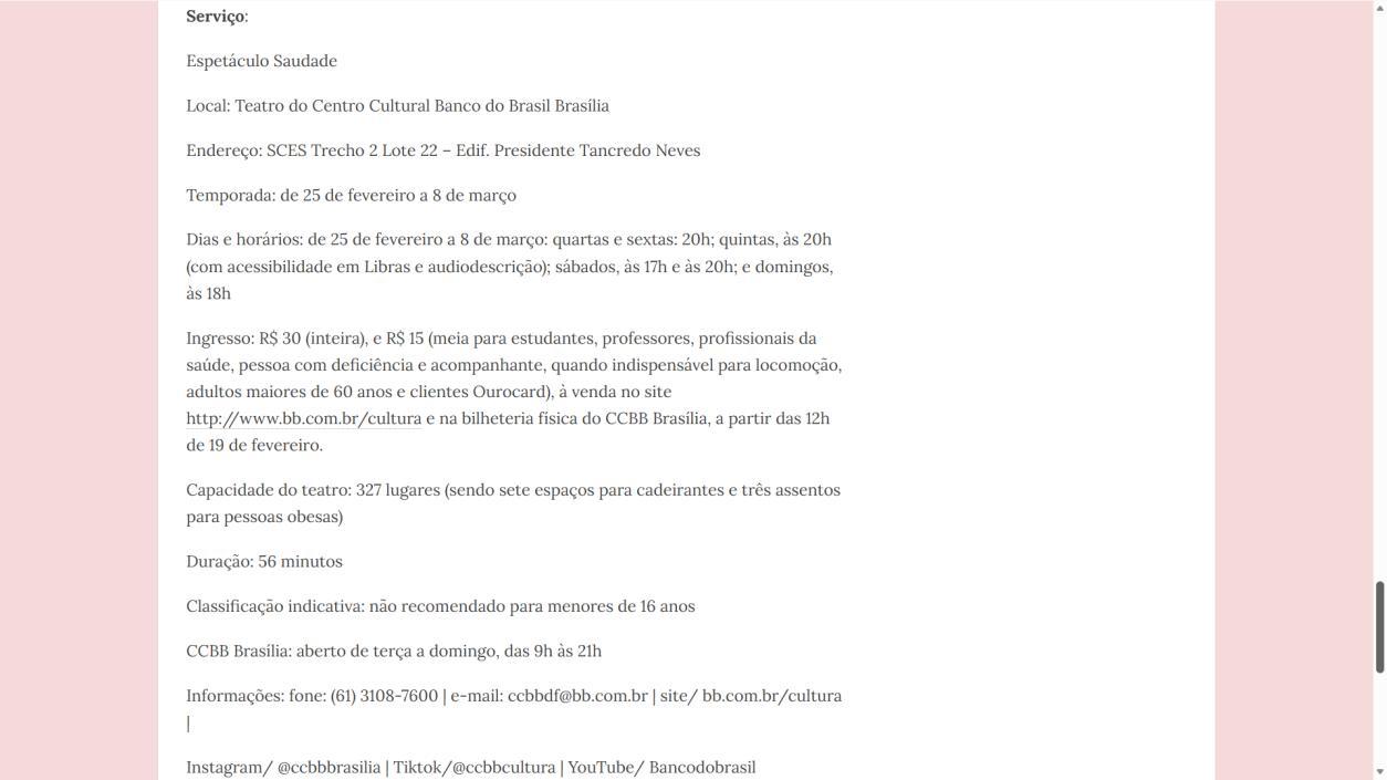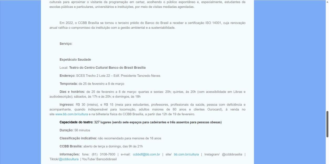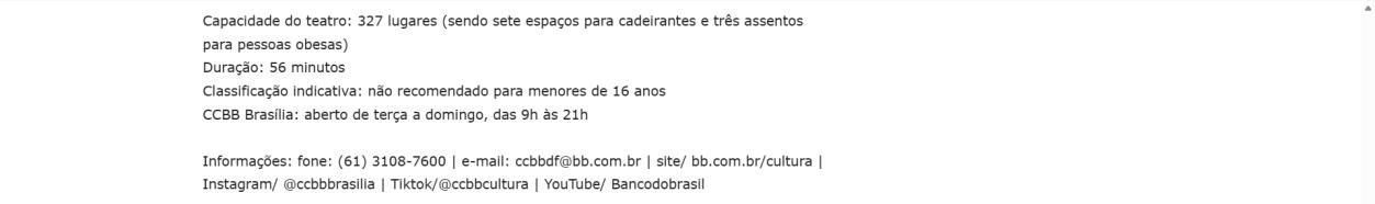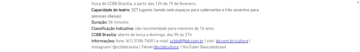 Informações: fone: (61) 3108-7600 | e-mail: ccbbdf@bb.com.br | site/ bb.com.br/cultura | Instagram/ @ccbbbrasilia | Tiktok/@ccbbcultura | YouTube/ Bancodobrasil