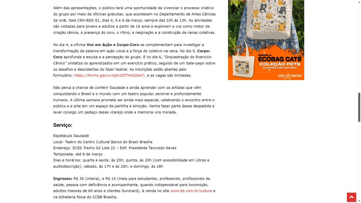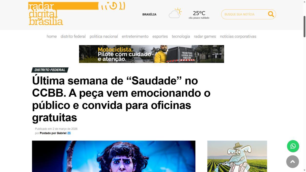 Última semana de "Saudade" no CCBB. A peça vem emocionando o público e convida para oficinas gratuitas - RADAR DIGITAL BRASÍLIA