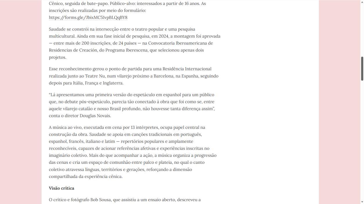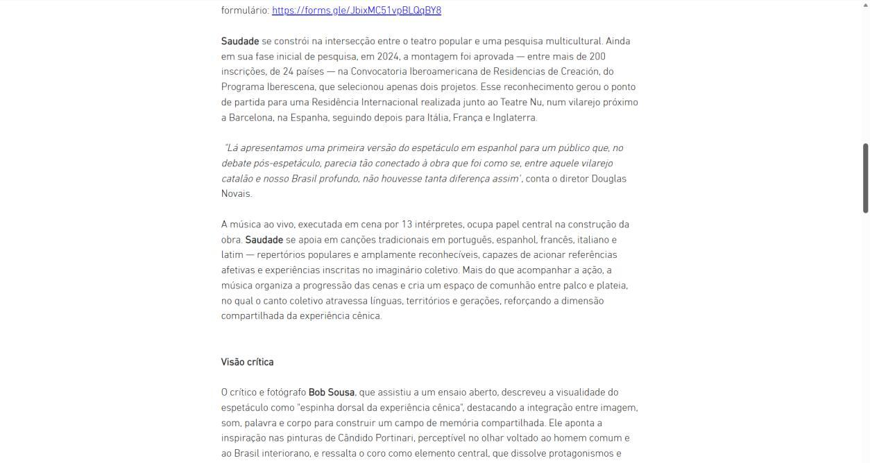 Saudade se constrói na intersecção entre o teatro popular e uma pesquisa multicultural. Ainda em sua fase inicial de pesquisa, em 2024, a montagem foi aprovada entre mais de 200 inscrições, de 24 países na Convocatoria Iberoamericana de Residencias de Creación, do Programa Iberescena, que selecionou apenas dois projetos. Esse reconhecimento gerou o ponto de partida para uma Residência Internacional realizada junto ao Teatre Nu, num vilarejo próximo a Barcelona, na Espanha, seguindo depois para Itália, França e Inglaterra.